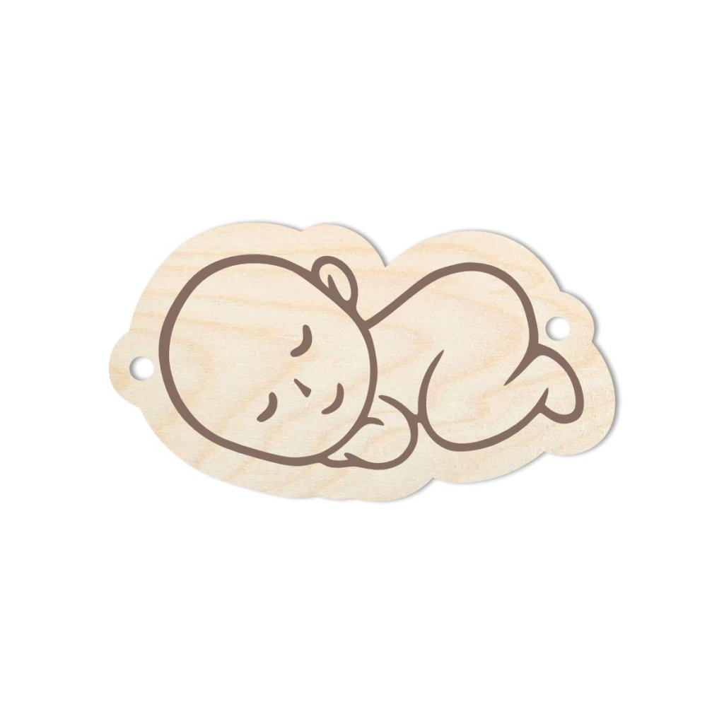 Sperrholzausschnitt mit einem Bild eines Babys aus 3 mm dickem Birkensperrholz. Das Produkt ist unbearbeitet und eignet sich zur weiteren Verzierung von Fertigprodukten oder als Dekoration. Wir empfehlen die Verwendung von Acrylfarben zum Malen.