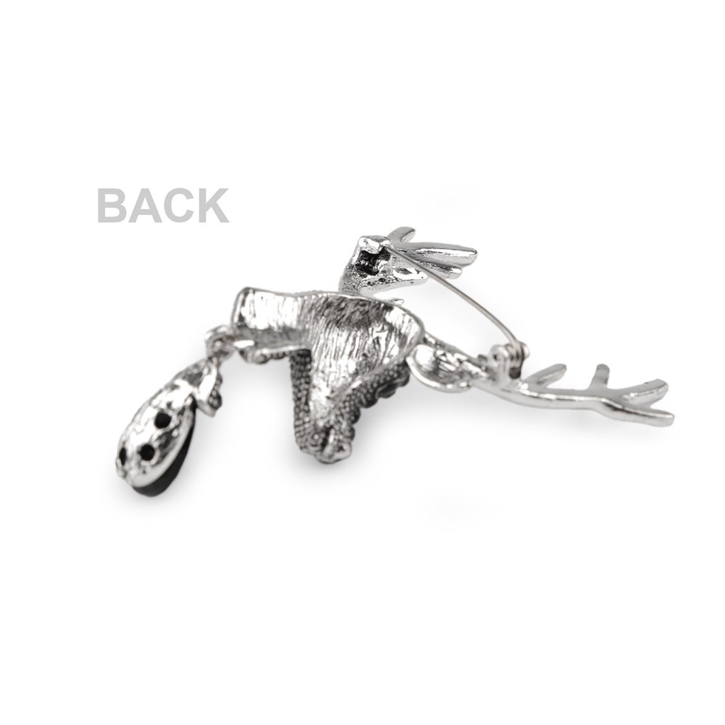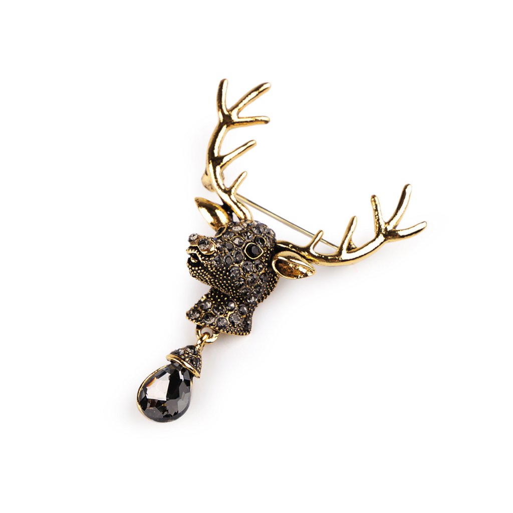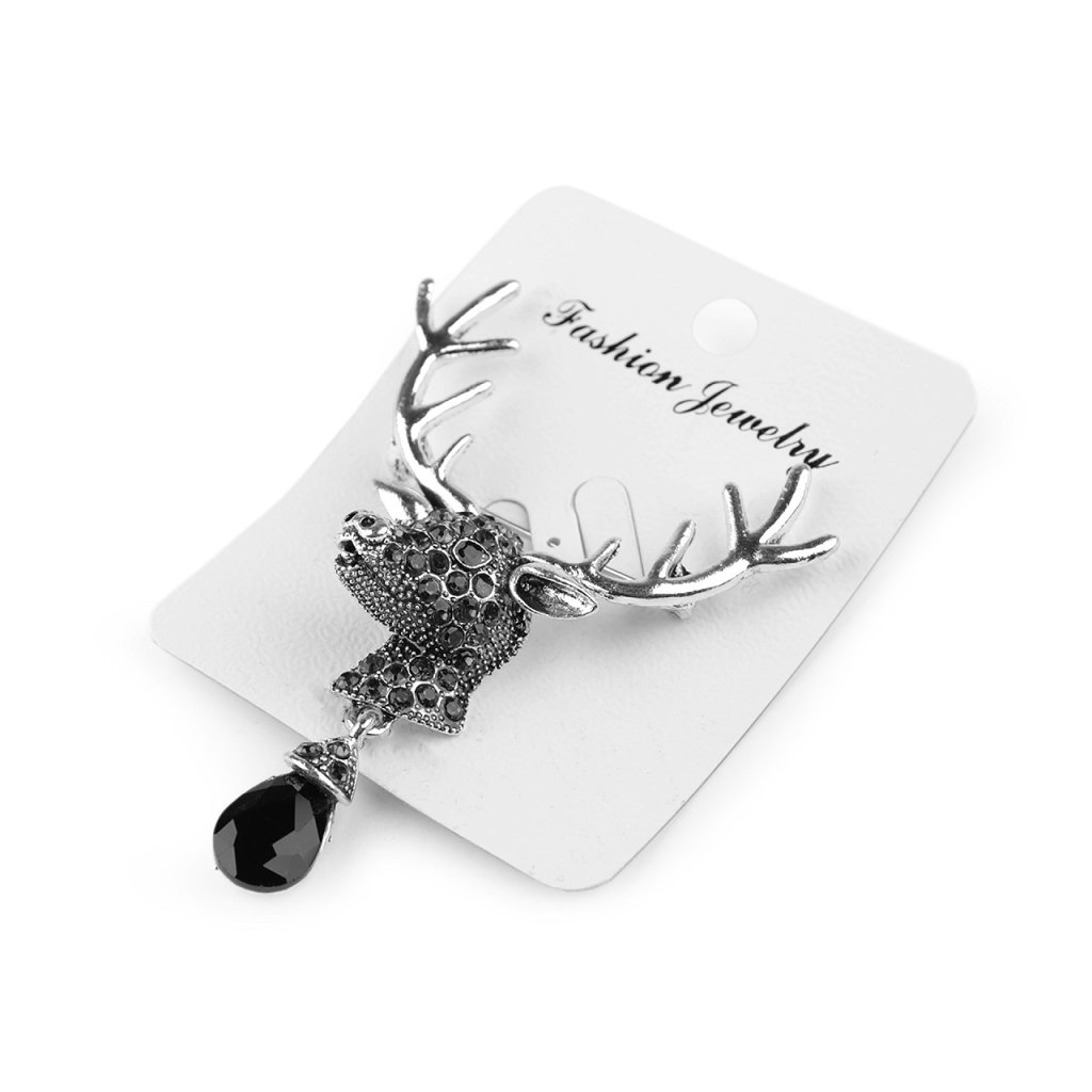 Eine elegante Brosche mit einem Hirschkopf und einem geschliffenen Stein fällt auf den ersten Blick ins Auge. Sie ist mit geschliffenen Steinen besetzt und glänzt attraktiv. Sie schmücken perfekt Jacken, Pullover, Handtaschen oder Hüte. Sie eignet sich auch zum dekorativen Befestigen eines Schals. Die Brosche besitzt auf der Rückseite eine Broschennadel. Sie befindet sich auf einer Plastikkarte, welche zum Aufhängen an den Verkaufsständern dient.