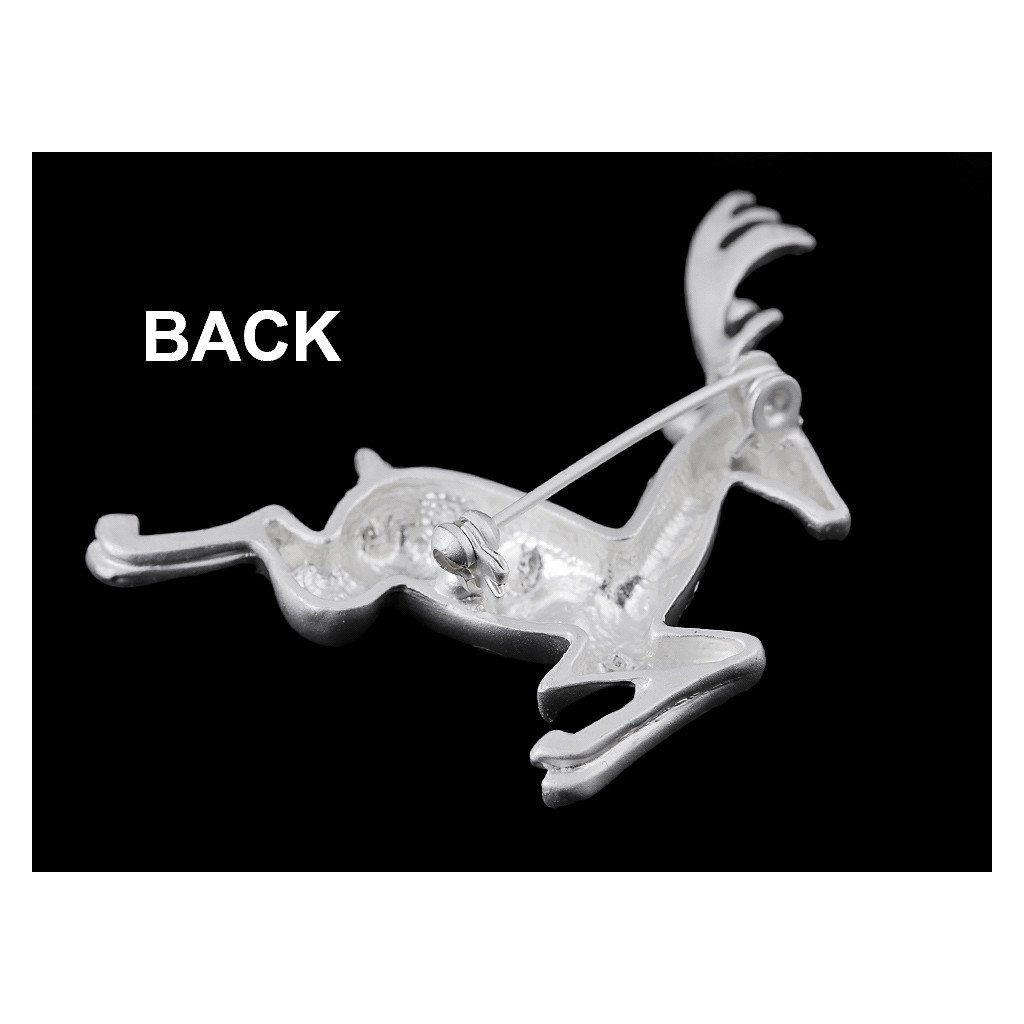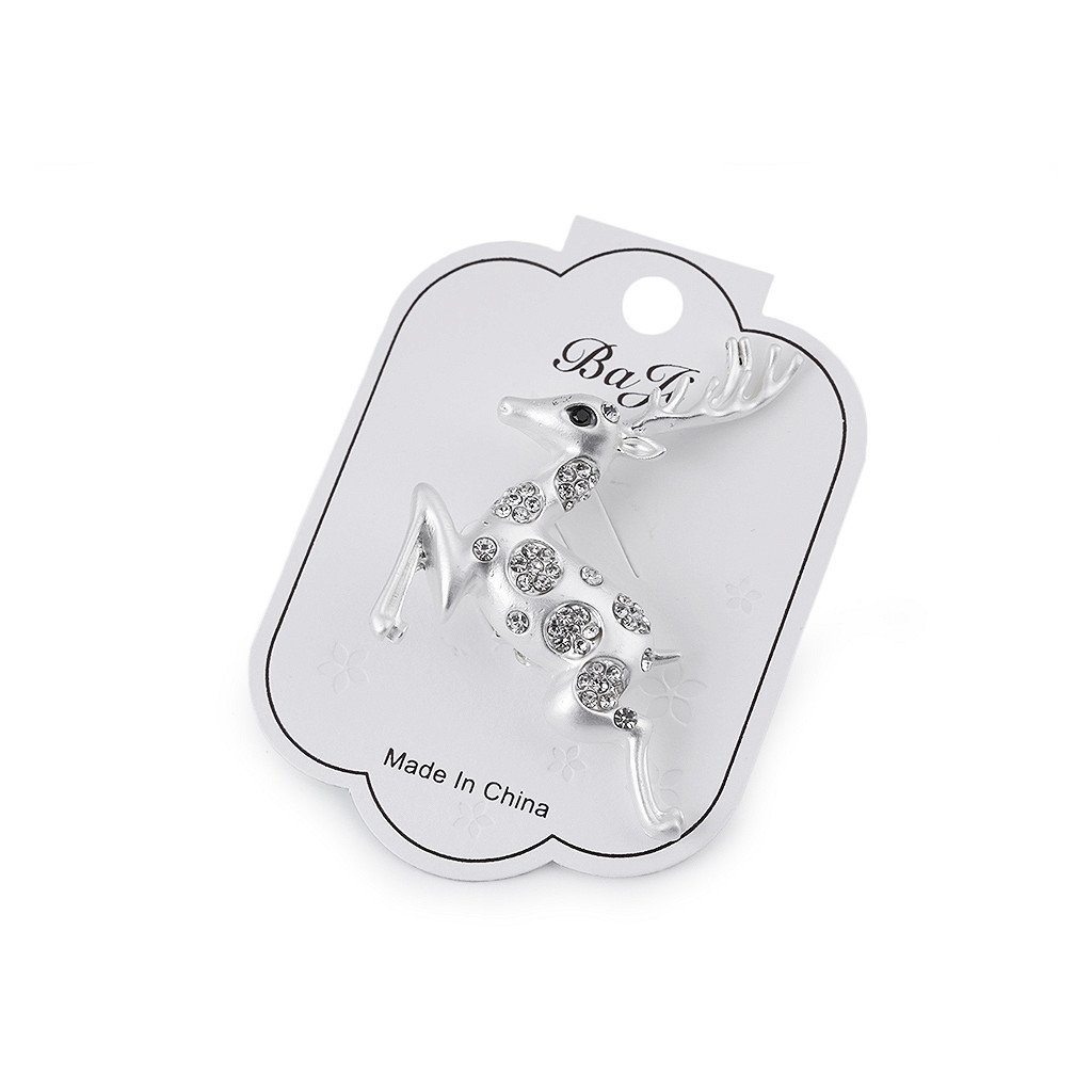 Die elegante Brosche mit Hirsch wird eine interessante Ergänzung Ihrer Kleidung sein. Hemden, Jacken, Pullover, Handtaschen oder Hüte eignen sich hervorragend für funkelnde Steinschnitte . Es hat ein mattes Finish. Die Brosche hat eine Broschennadel und einen Öffnungsverschluss hinten. Es befindet sich auf einer Plastikkarte, die an ein Verkaufsregal gehängt werden kann.