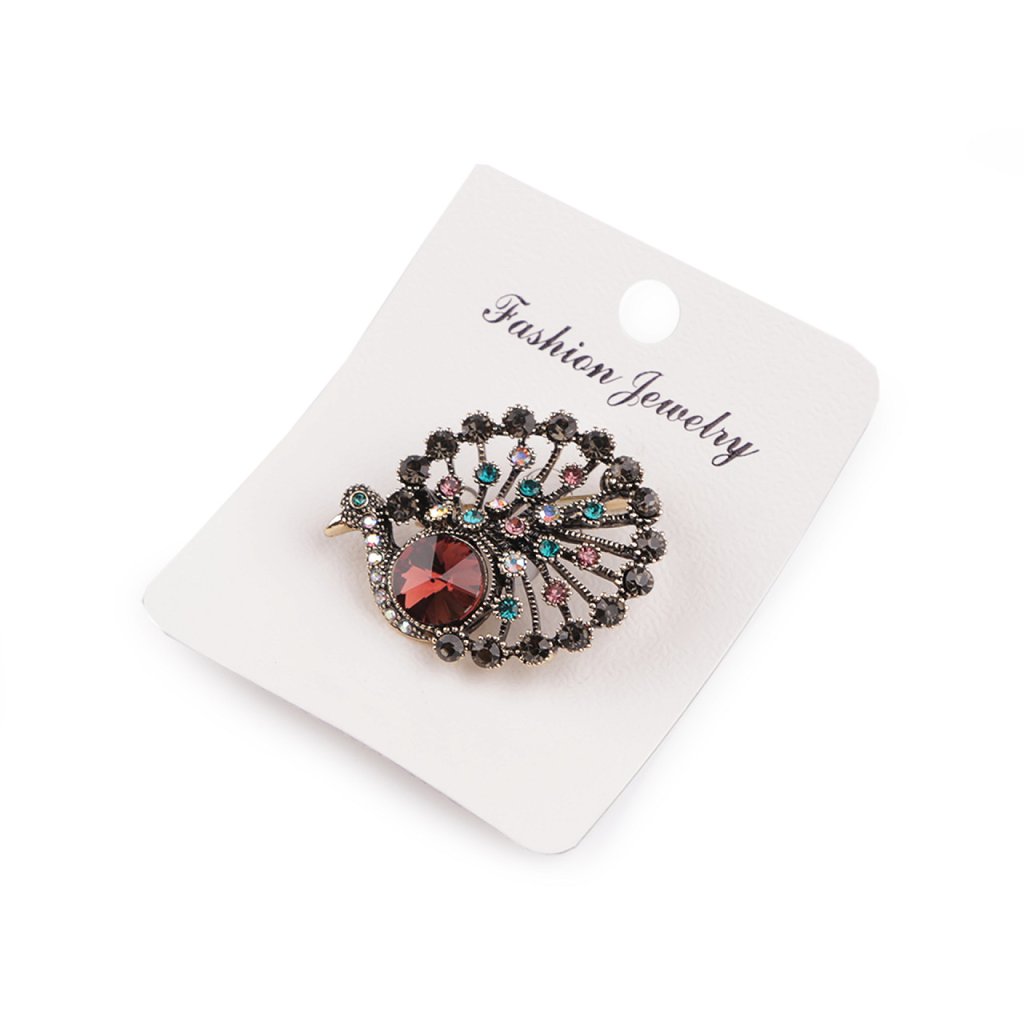 Die elegante Pfauenbrosche funkelt dank der Strasssteine effektvoll. Es spielt mit allen Farben, aber in einem dezenten, gedämpften Ton. Auf der Rückseite befindet sich eine Sicherheitsnadel. Es wirkt nicht nur auf Kleidung wirkungsvoll, sondern eignet sich auch zum Verzieren von Mützen, Taschen oder zum Befestigen eines Schals. Die Brosche befindet sich auf einer Plastikkarte, die an den Verkaufsregalen aufgehängt werden kann.