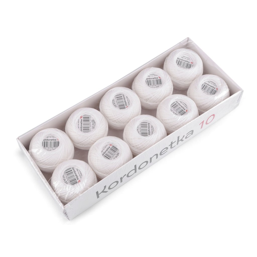 Wir bieten Cordonette-Häkel- und Klöppelgarn in verschiedenen Stärken an. Es ist sehr hochwertig, aus 100% Baumwolle . Es ist zum Häkeln von Decken, Tagesdecken, Vorhängen usw. bestimmt. Es ist beliebt zum Häkeln von kleinen Engeln und Weihnachts- oder Osterdekorationen. Das Garn ist auch zum Aufspulen geeignet. Jeder Ball wiegt 20 g. Cordonette Nr. 10 hat eine Wicklung von ca. 110 m und einen Fadendurchmesser von 0,80 mm. Cordonette Nr. 15 hat eine Wicklung von ca. 134 m und einen Fadendurchmesser von 0,77 mm. Cordonette Nr. 30 hat eine Wicklung von ca. 167 m und einen Fadendurchmesser von 0,68 mm. Cordonette Nr. 50 hat eine Wicklung von ca. 227 m und einen Fadendurchmesser von 0,56 mm. Cordonette Nr. 60 hat eine Wicklung von ca. 250 m und einen Fadendurchmesser von 0,44 mm. Cordonette Nr. 80 hat eine Wicklung von ca. 340 m und einen Fadendurchmesser von 0,30 mm. Wir liefern Garn in einer Packung zu 10 Stück in einer Schachtel ohne Deckel, die mit Selbstschrumpffolie überzogen ist.