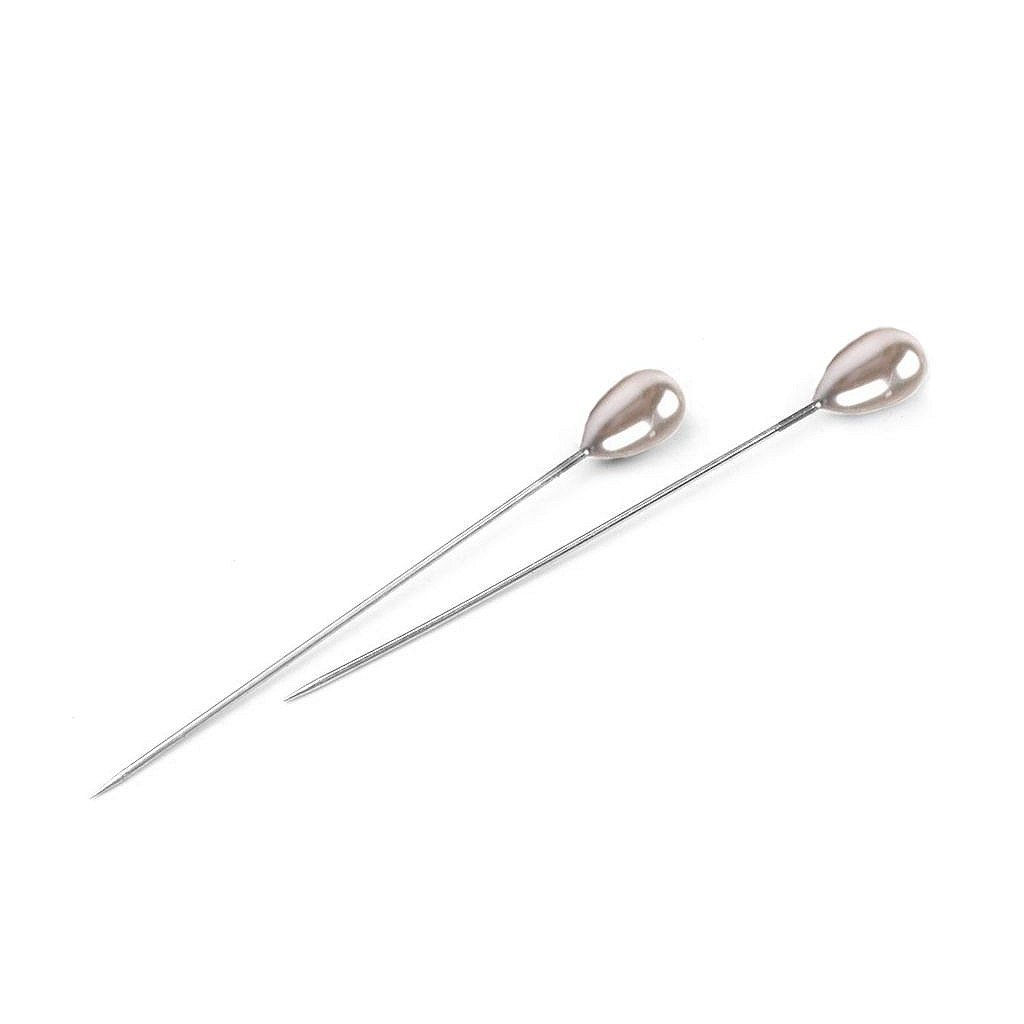 Dekorative Stecknadeln mit perlmutternem Kopf in Tropfenform. Dieser Typ dient zum Befestigen der Dekoration (z. B. in die Blumensträuße, auf dem feierlichen Tisch usw.). Die Stecknadel ist biegsam.