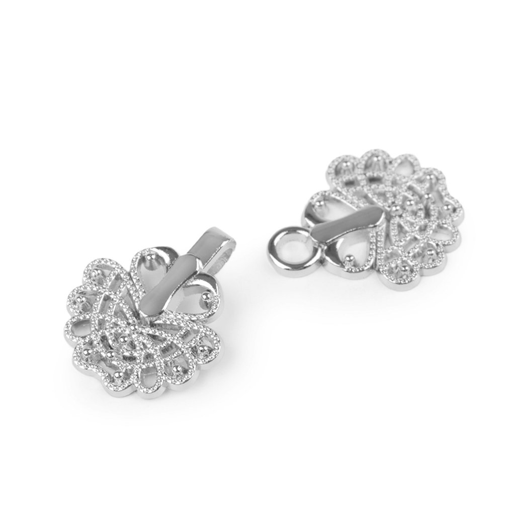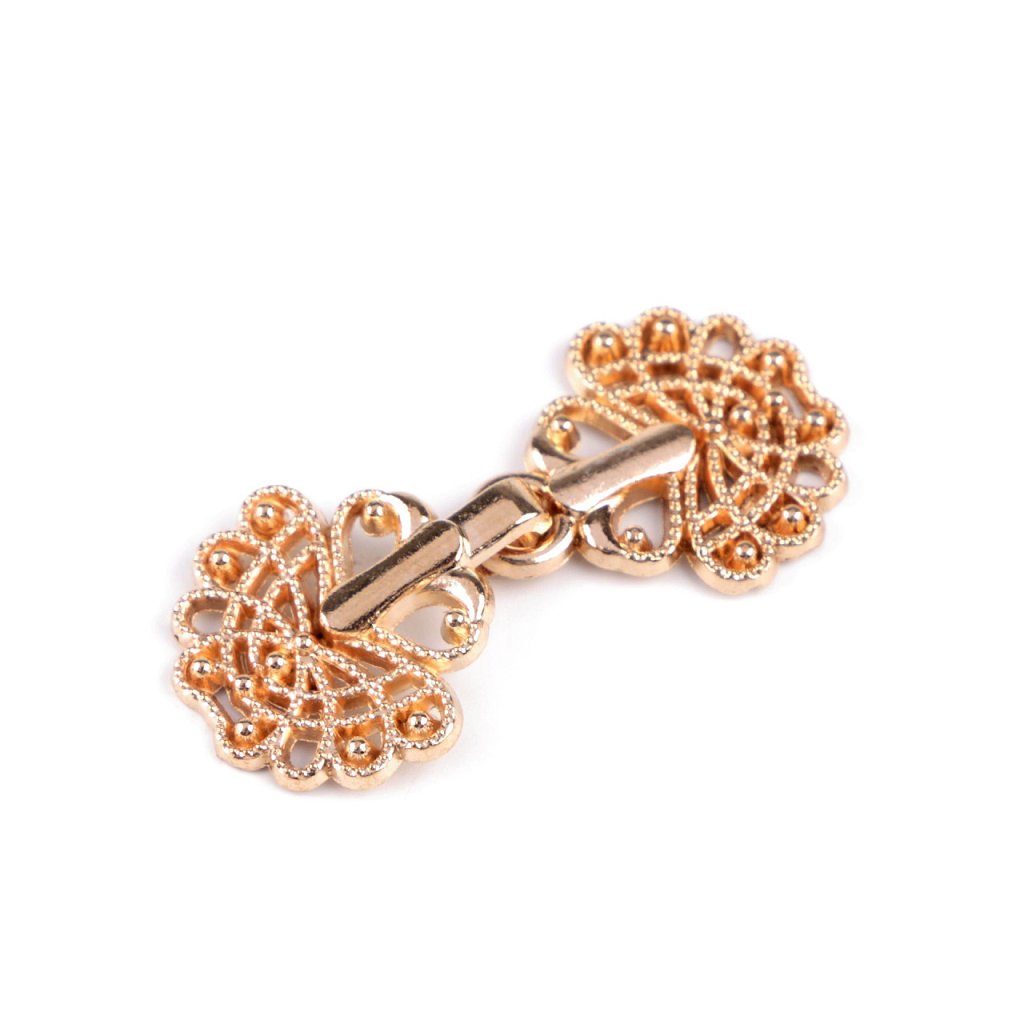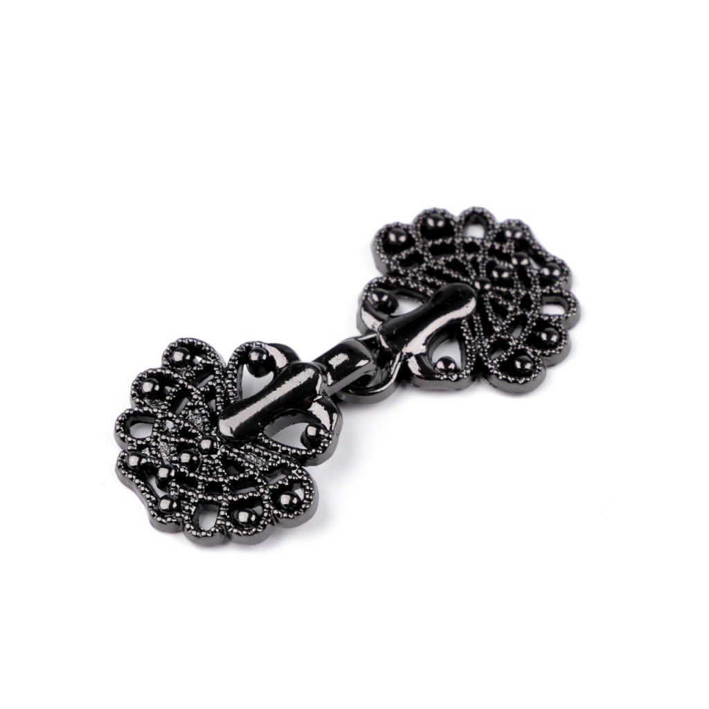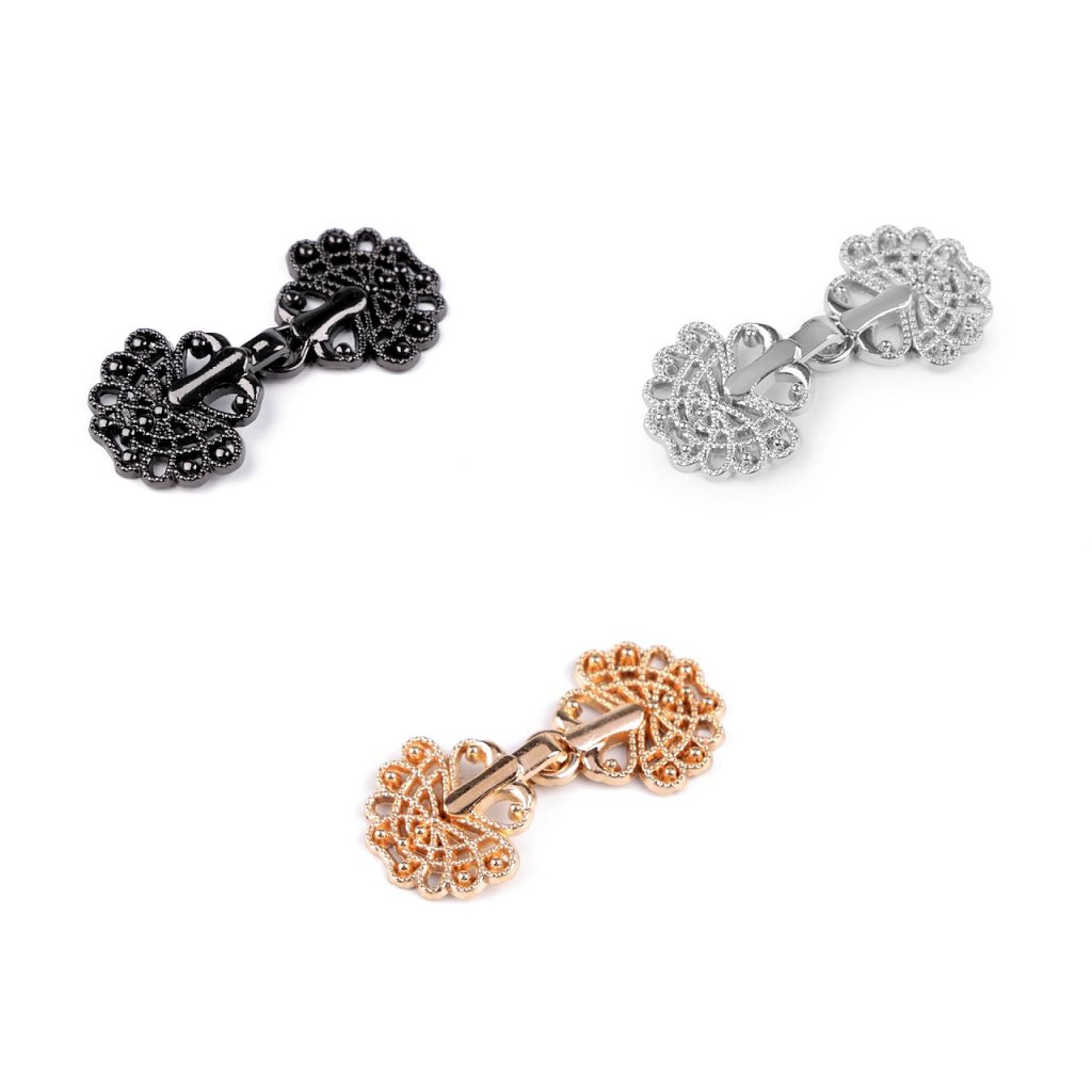 Der dekorative filigrane Verschluss besteht aus zwei Teilen, die Sie einfach ineinander einhaken können. Sie können es anstelle von Knöpfen auf Blusen, Strickjacken, Westen, Pullover usw. nähen.