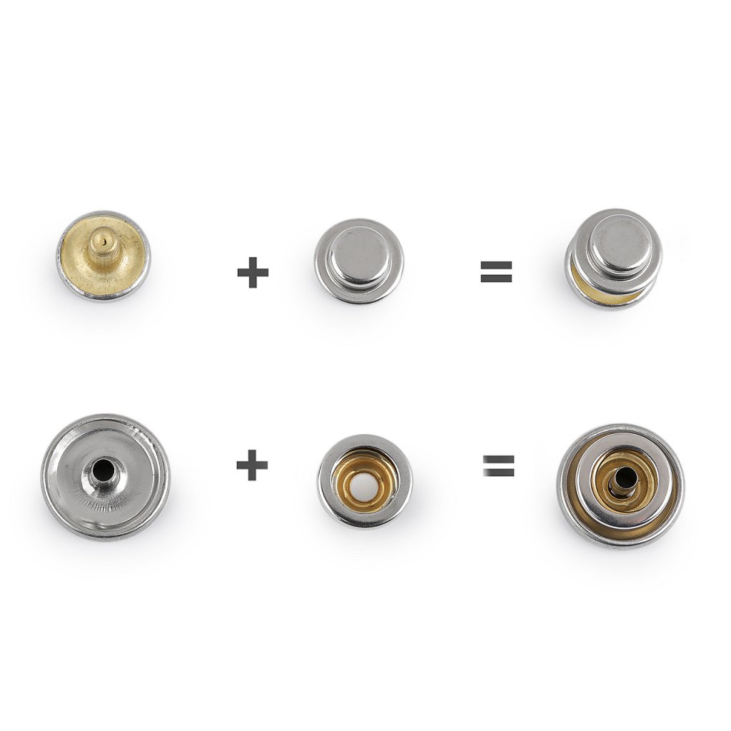 Doppelseitige Druckknöpfe aus Edelstahl eignen sich als Verschlüsse für Kleidung und Accessoires (Sportjacken, Westen, Regenmäntel, Taschen, Rucksäcke usw.). Die Vernietung erfolgt durch Nieten. Kolben und eine Presse, die unter der Nummer 070241 oder 790770 geführt wird. Nieten eignen sich für klassische Stoffe. Das Set besteht aus 4 Teilen.