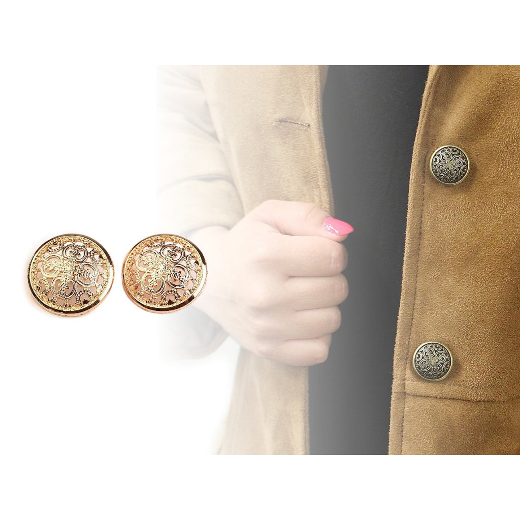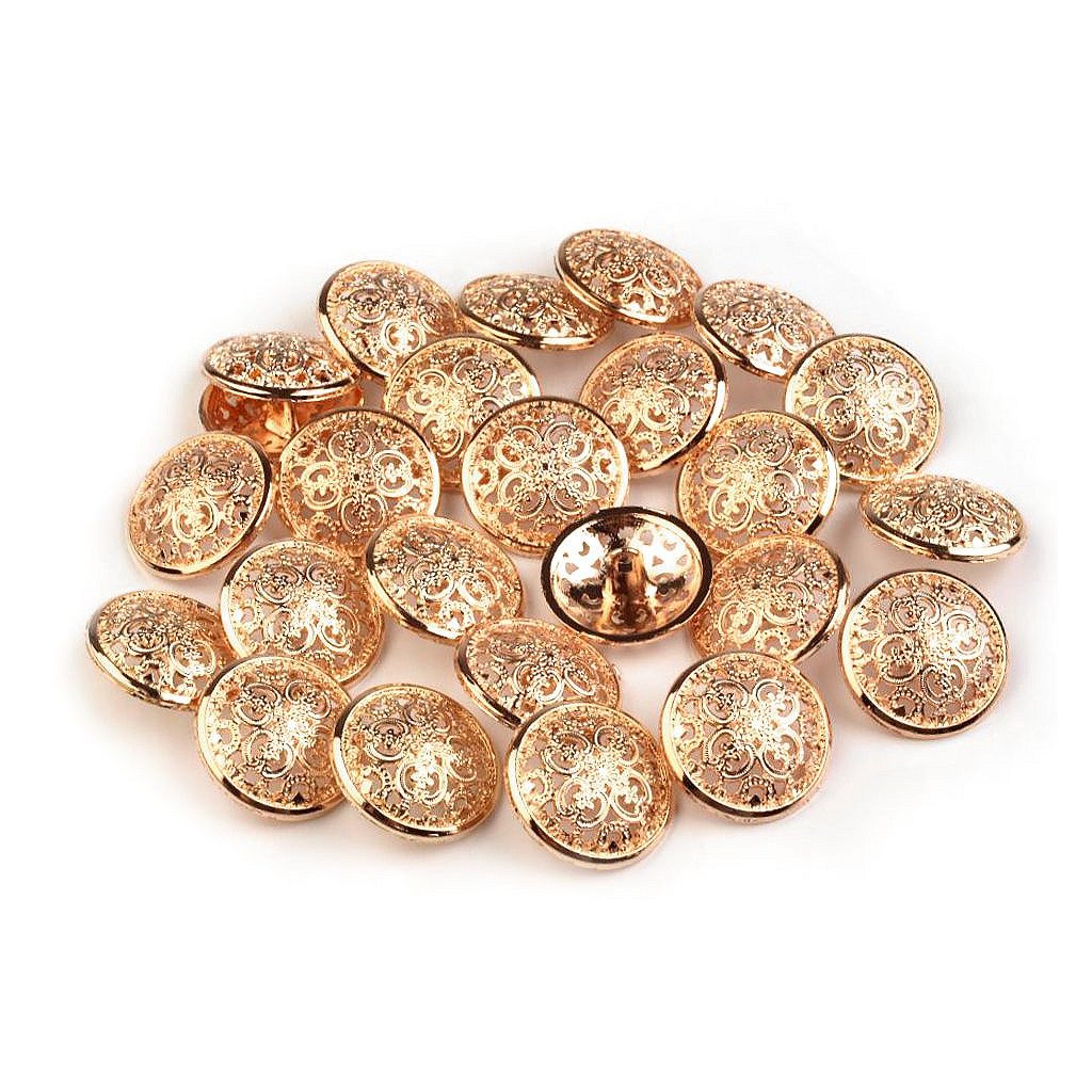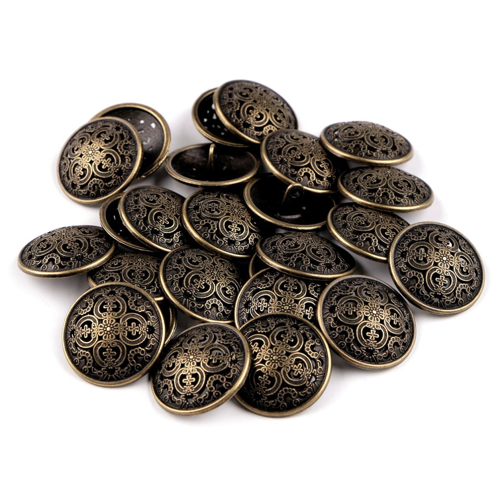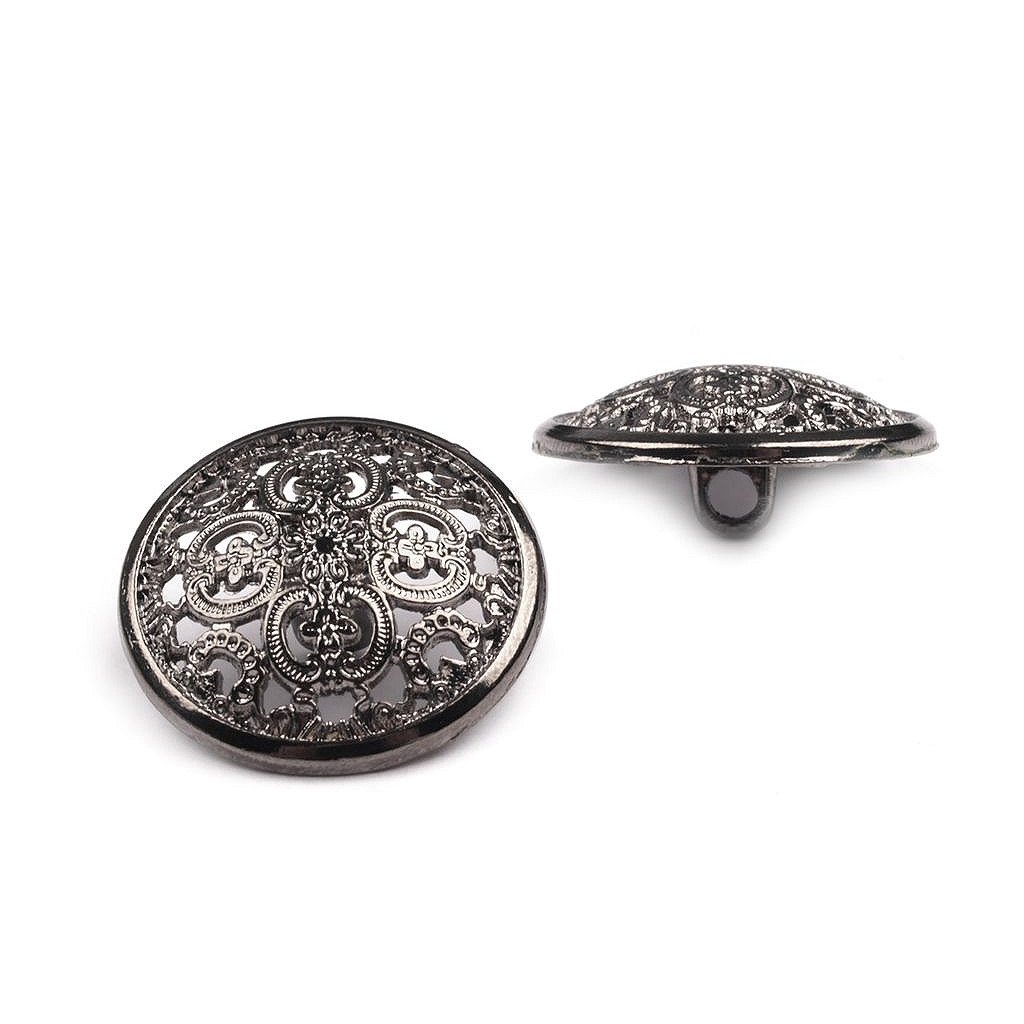 Knöpfe aus Metall mit Filigranmuster. Sie sind aus der Legierung von Zink und nicht magnetischen Metallen hergestellt. Die Knöpfe werden von unten angenäht. Sie wirken elegant an Mänteln, Sakkos, Hemden usw. Bestimmt sind sie auch für Handtaschen, Taschen oder Hüte.