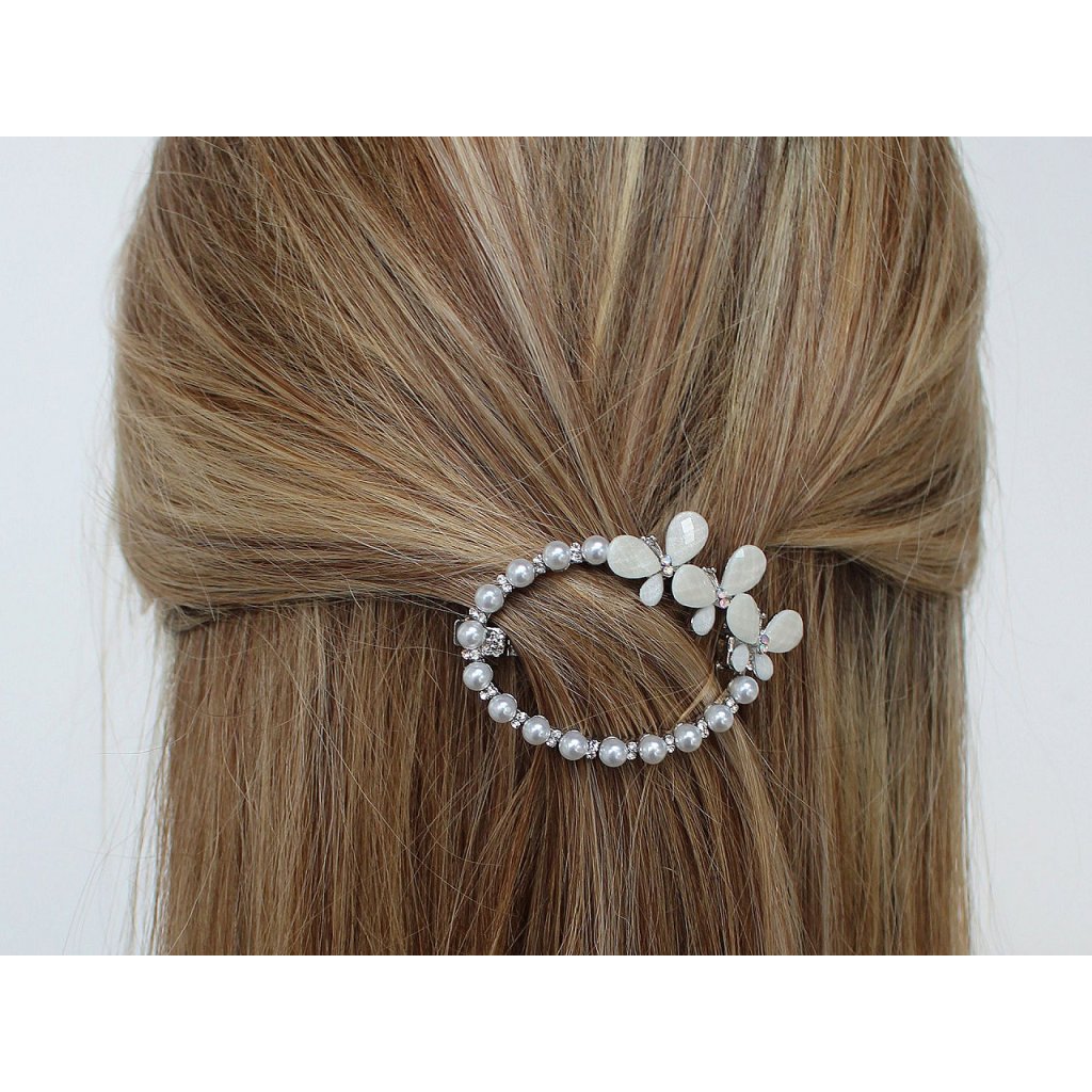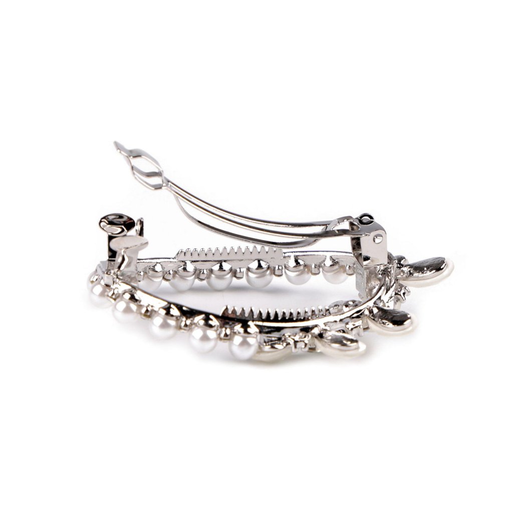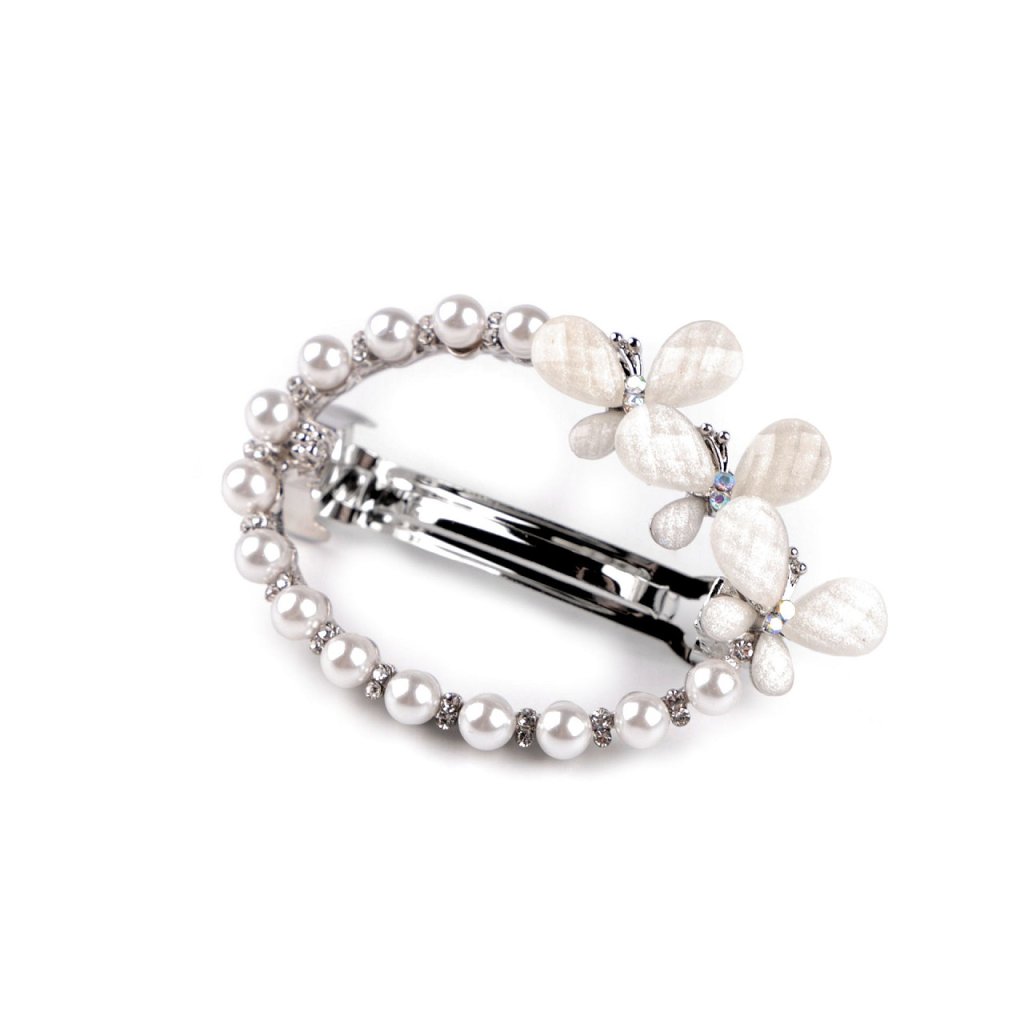 Die französische Haarspange mit Perlen und Strasssteinen ist mit Schmetterlingen verziert. Sie schmückt perfekt eine festliche Frisur, egal ob Sie zu einer Hochzeit, einer Party oder einem romantischen Abendessen gehen. Sie verleiht Ihrem Look Charme und Eleganz. Sie können sie verwenden, um Ihr Haar bei komplexen Frisuren zu fixieren oder einfach Strähnen nach hinten zu ziehen. Sie hat eine hochwertige Ganzmetallkonstruktion , der Schnappmechanismus ist solide. Die Länge des Haarteils beträgt 3,5 cm.