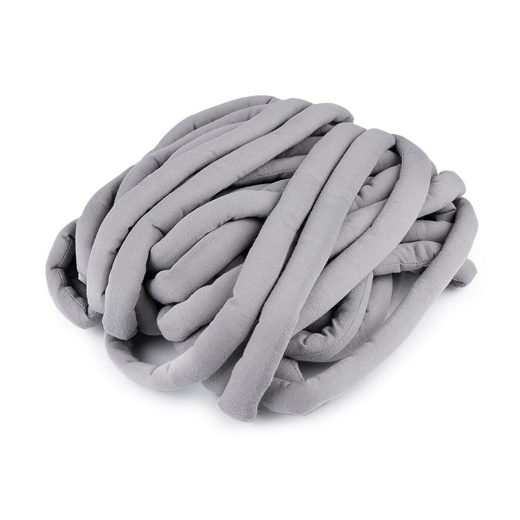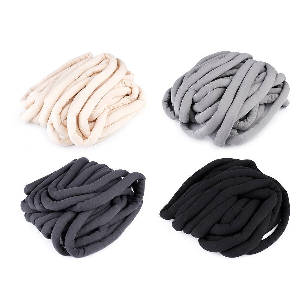 Marshmallow-Garn ist sperrig, aber leicht. Es besteht aus einem geflochtenen Tunnel aus feiner, glatter Baumwolle , der mit Fasern gefüllt ist. Es funktioniert gut mit großen Nadeln oder Händen. Das Garn eignet sich zur Herstellung von Decken, Maxi-Tagesdecken, Kissen und ähnlichem Zubehör.