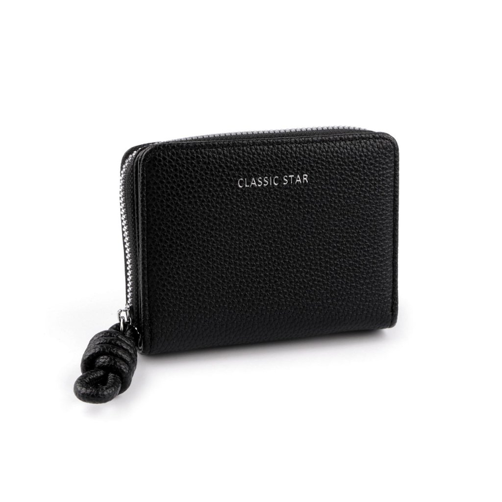 Damengeldbörse mit dekorativem Knoten verbindet stilvolle Eleganz und Funktionalität. Auf der Vorderseite befindet sich ein silberner Classic-Sternenaufdruck . Die Geldbörse hat eine kompakte Form , besteht aus hochwertigem Material mit einer matten Oberfläche, die sich angenehm anfühlt. Ihre Größe ist genau richtig für eine Handtasche. Die Vorderseite des Portemonnaies ist mit einem Reißverschluss verschlossen. Im Inneren finden Sie 6 Kreditkartenfächer, davon 1 mit transparentem Fenster. Außerdem gibt es ein Fach für Geldscheine. Das Münzfach befindet sich an der Seite des Portemonnaies, es ist mit einem Reißverschluss verschlossen. Es ist durch einen Trenner in 2 Fächer unterteilt.