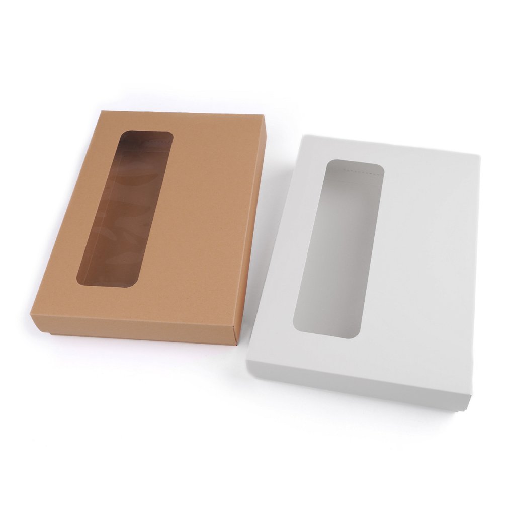 Die Papierbox hat einen rechteckigen Ausschnitt im transparenten Foliendeckel. Sie können damit Geschenke, Schals, Handschuhe, Mützen usw. verpacken. Sie können es auch nach Ihrem Geschmack dekorieren. Wir liefern die Box in zerlegtem Zustand (oberer Deckel - 36 x 44 cm, unterer Teil der Box - 40 x 48 cm). Sie können es einfach an den markierten Biegekanten falten. Die Größe des Fensters beträgt 6 x 20 cm. Wir haben eine Fotoanleitung zum Falten der Box für Sie vorbereitet.
