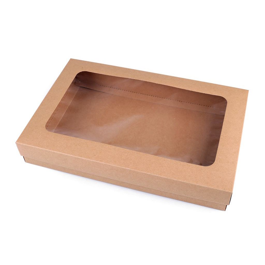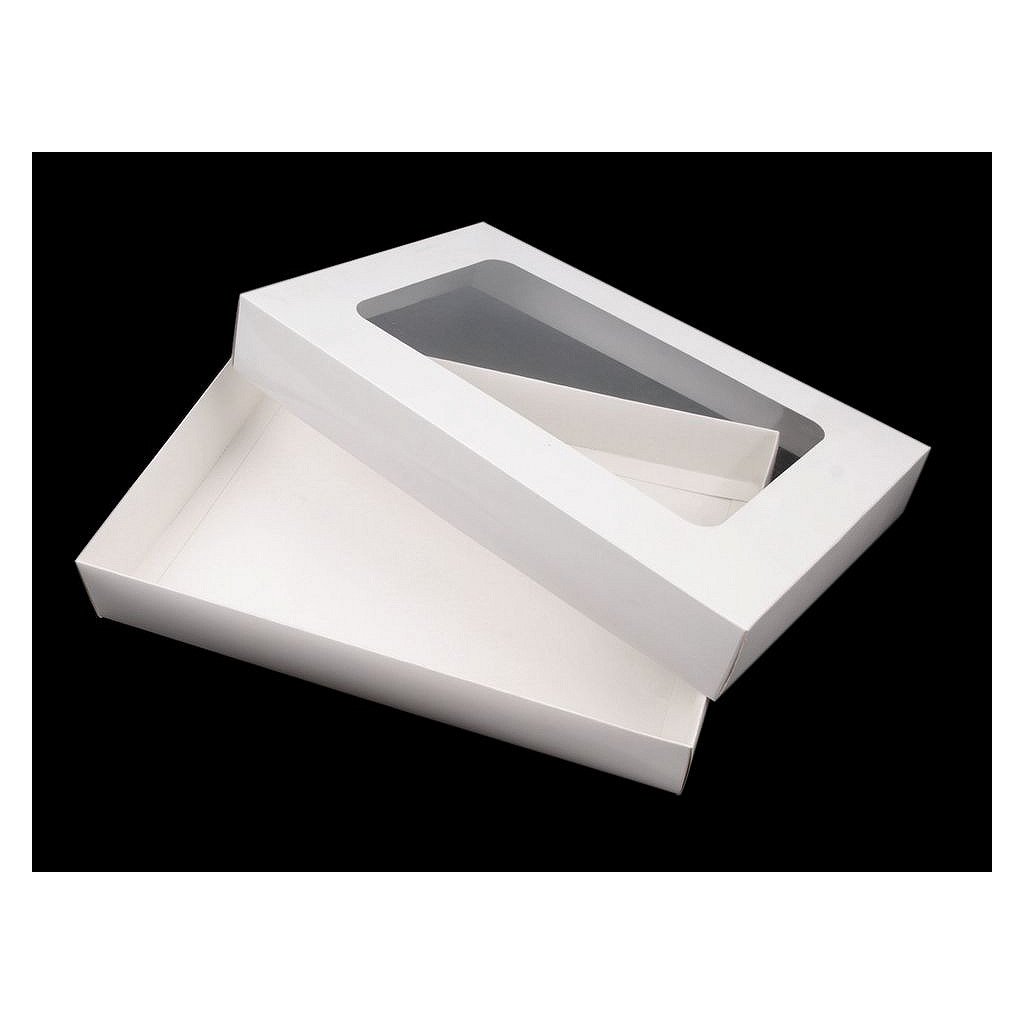 Eine größere Papierschachtel hat eine Aussparung im transparenten Foliendeckel. Sie können es zum Verpacken von Geschenken, Schals, Tüchern, zum Aufbewahren von Weihnachtsschmuck usw. verwenden. Sie können es sogar nach Ihrem Geschmack dekorieren. Wir liefern die Box im aufgeklappten Zustand (oberer Deckel - 36 x 44 cm, unterer Teil der Box - 44 x 55 cm). Sie können es einfach an den markierten Biegekanten falten. Die Größe des Fensters beträgt 15,5 x 27,5 cm.