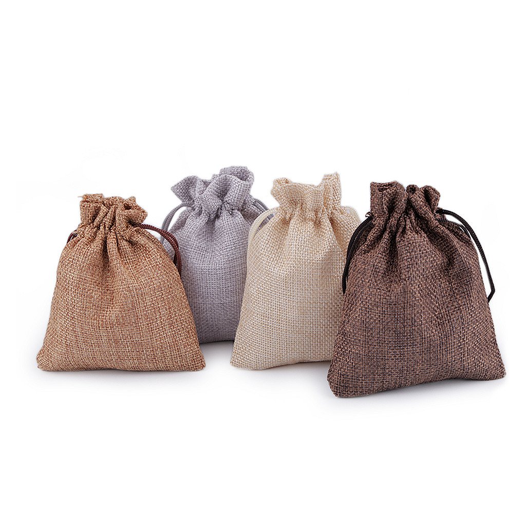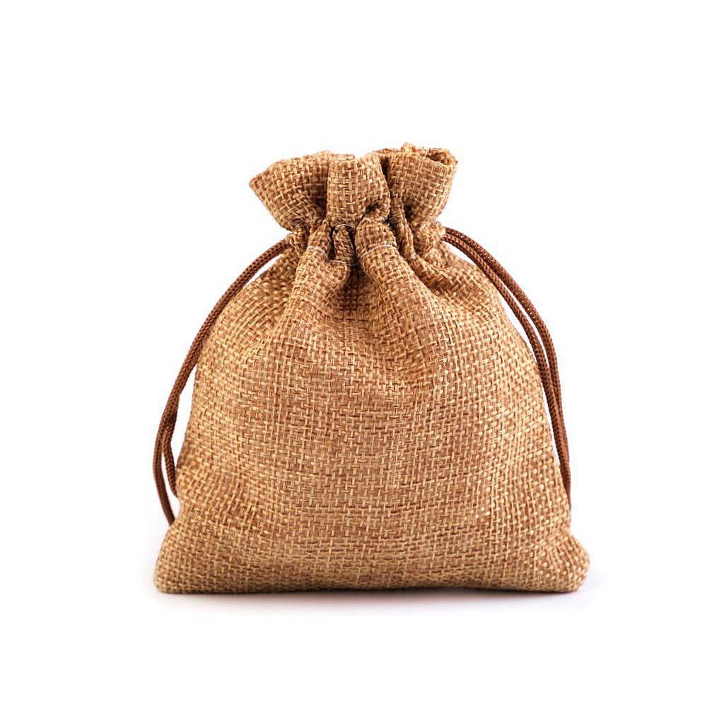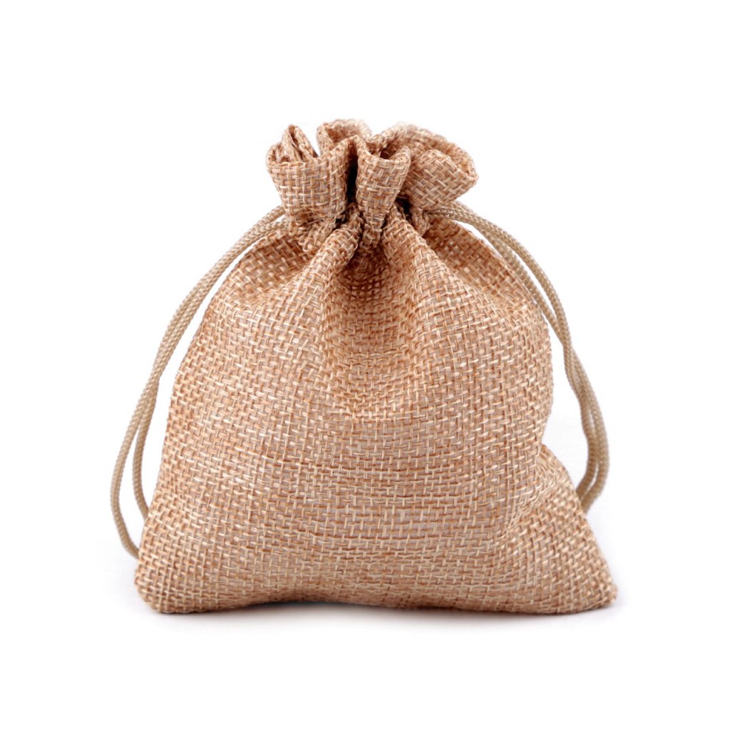 Geschenksäckchen erinnert mit Material an natürliche Jute und ist einfach mit zwei Polyesterschnürchen zusammenzuziehen. Drinnen gibt es Schicht aus Vlies.