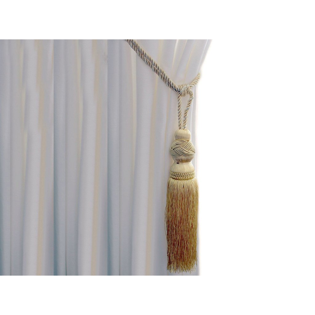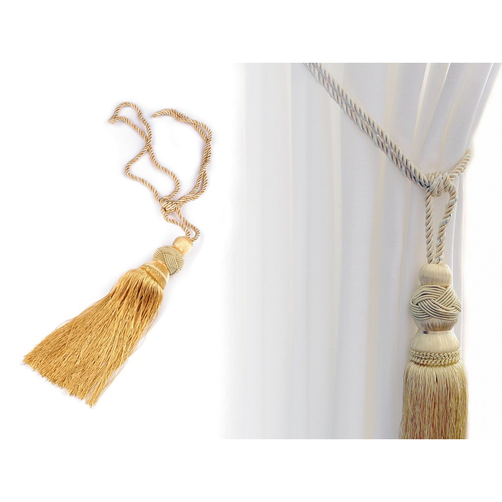 Auf der dekorativen verdrillten Schnur befindet sich eine robuste Quaste . Die Schnur ist zweifarbig. Es ist ein Schmuckstück für Vorhänge, Vorhänge und Innenräume. Länge 69 cm.
