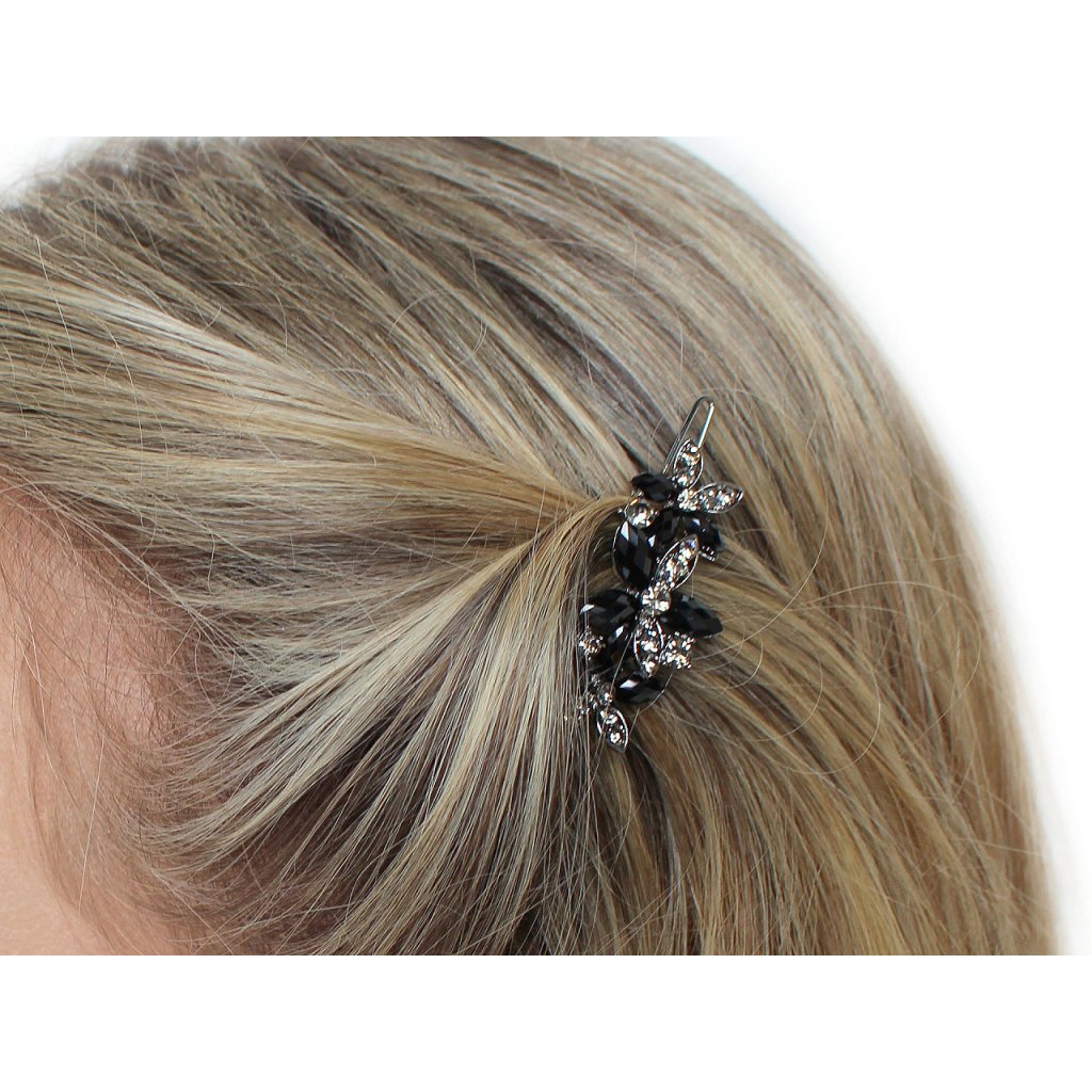 Eine elegante Haarspange mit geschliffenen Steinen in Blumenform ist das perfekte Accessoire, um jede Frisur aufzupeppen. Sie ist aus hochwertigem Schmuckmetall gefertigt, hat kleine Zähne auf der Rückseite und hält gut im Haar. Sie eignet sich für verschiedene gesellschaftliche Anlässe, aber auch für den Alltag, da sie Ihre Frisur interessant schmückt. Es befindet sich auf einer Plastikkarte, die sich zum Aufhängen an einem Verkaufsständer eignet.