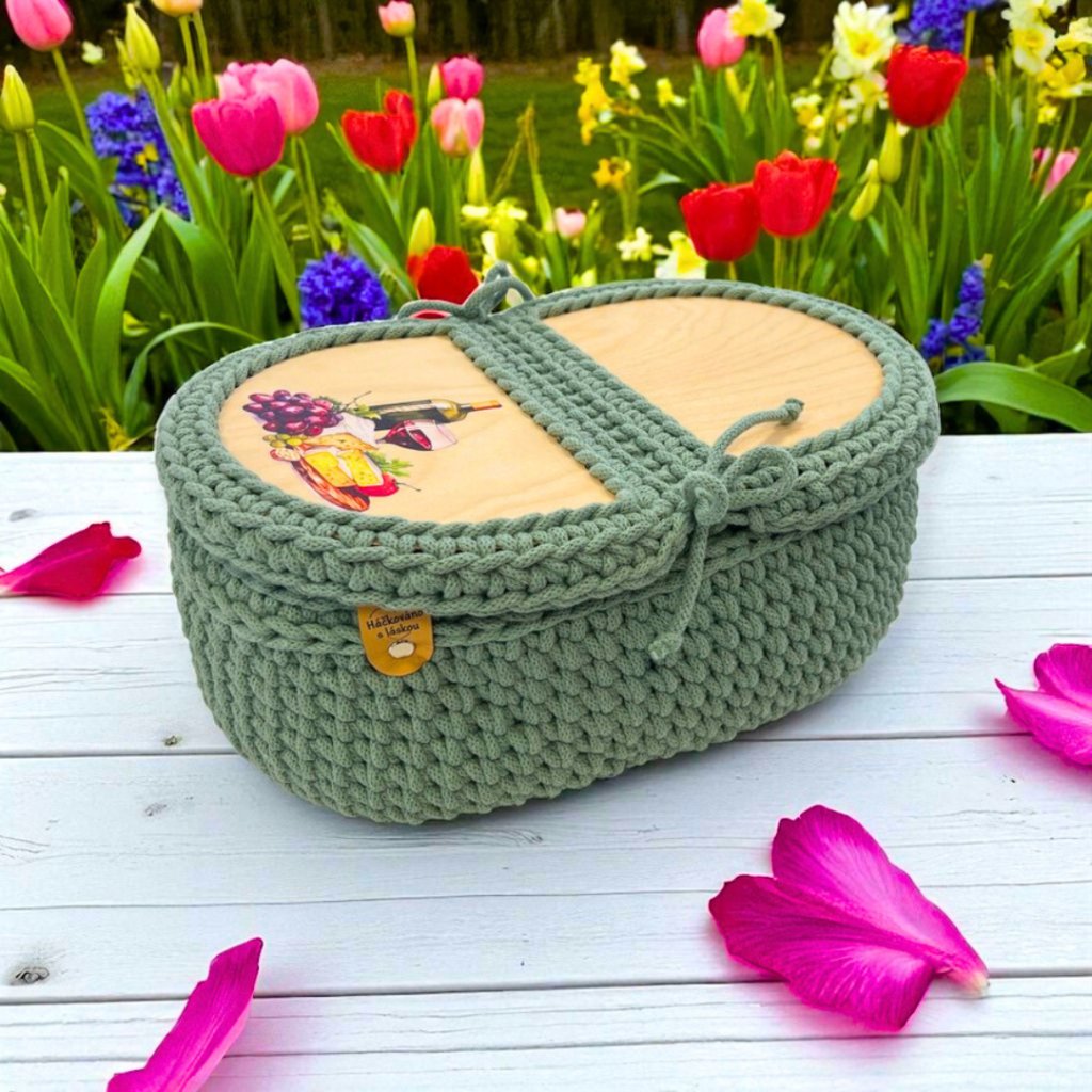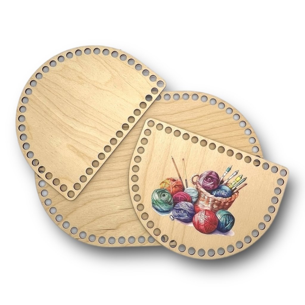 Set zur Herstellung eines gehäkelten Brotkastens ohne Garn. In diesem Set ist ein ovaler Holzboden, ein Teil des Holzdeckels mit Druck, der andere Teil des Holzdeckels ohne Druck enthalten. Wenn Sie möchten, dass der Brotkasten stabiler ist, können Sie auch den oberen Ring kaufen .