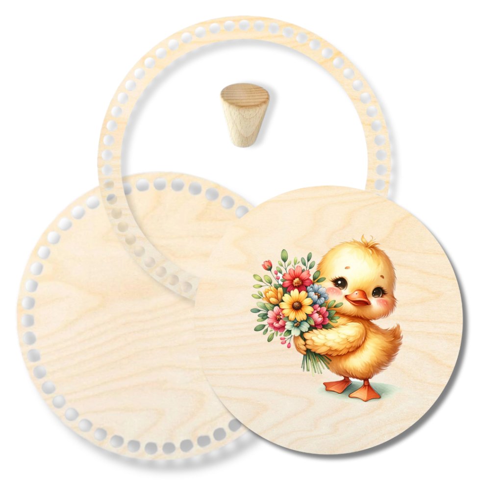Häkelkörbe mit Ring und Holzdeckel, 13 cm, Küken mit Blumenstrauß