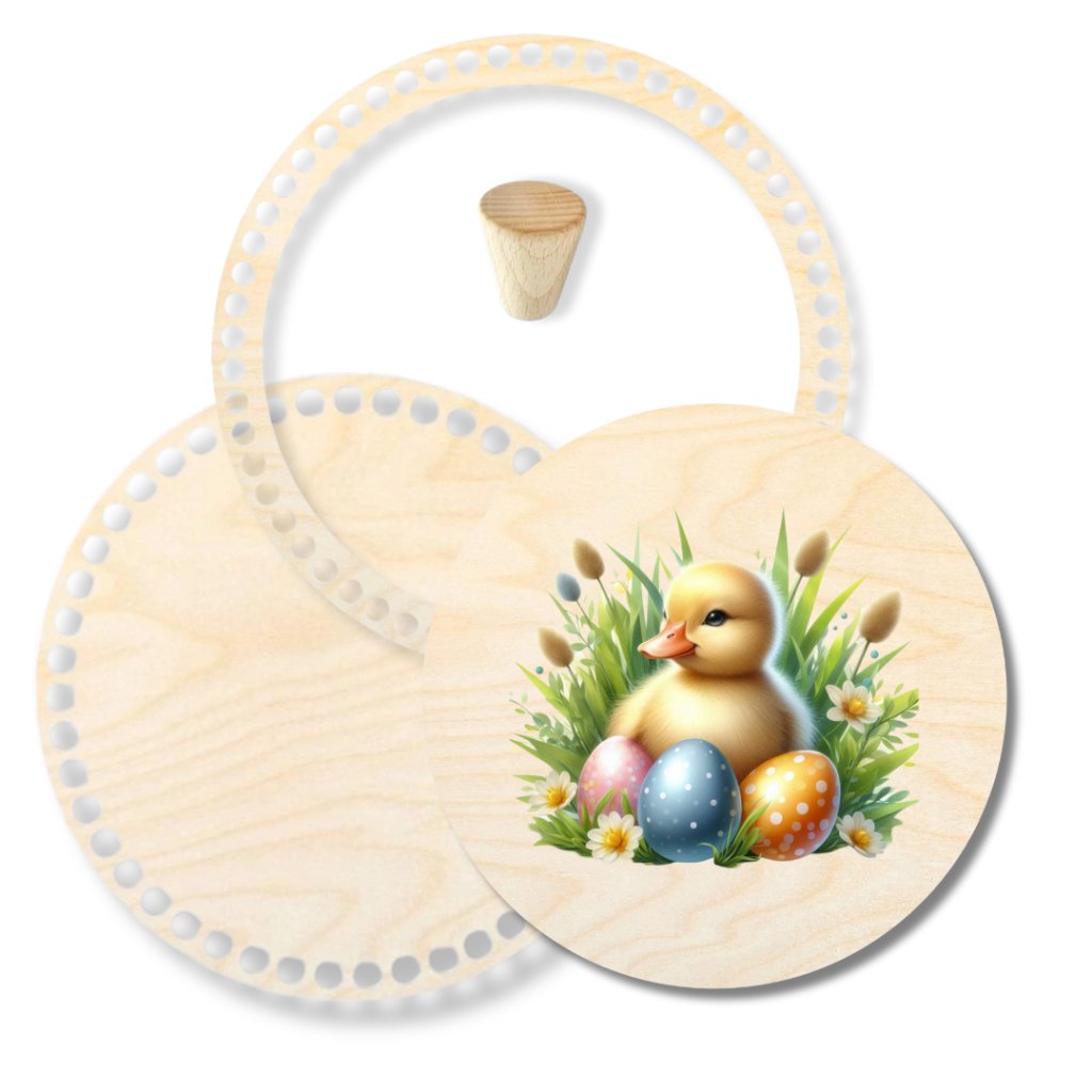 Häkelkörbe mit Ring und Holzdeckel, 18 cm, Ente mit Eiern