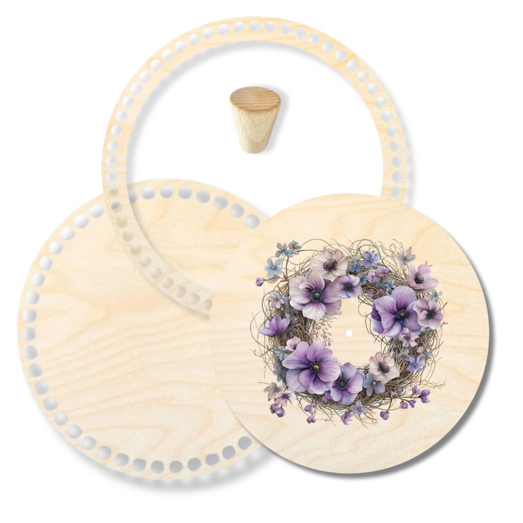 Häkelkörbe mit Ring und Holzdeckel, 18 cm, lila Kranz