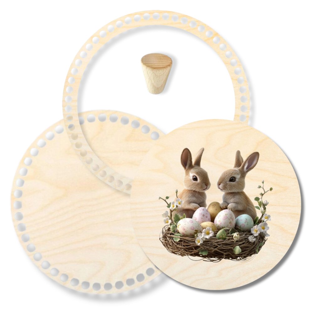 Häkelkörbe mit Ring und Holzdeckel, 18 cm, zwei Kaninchen