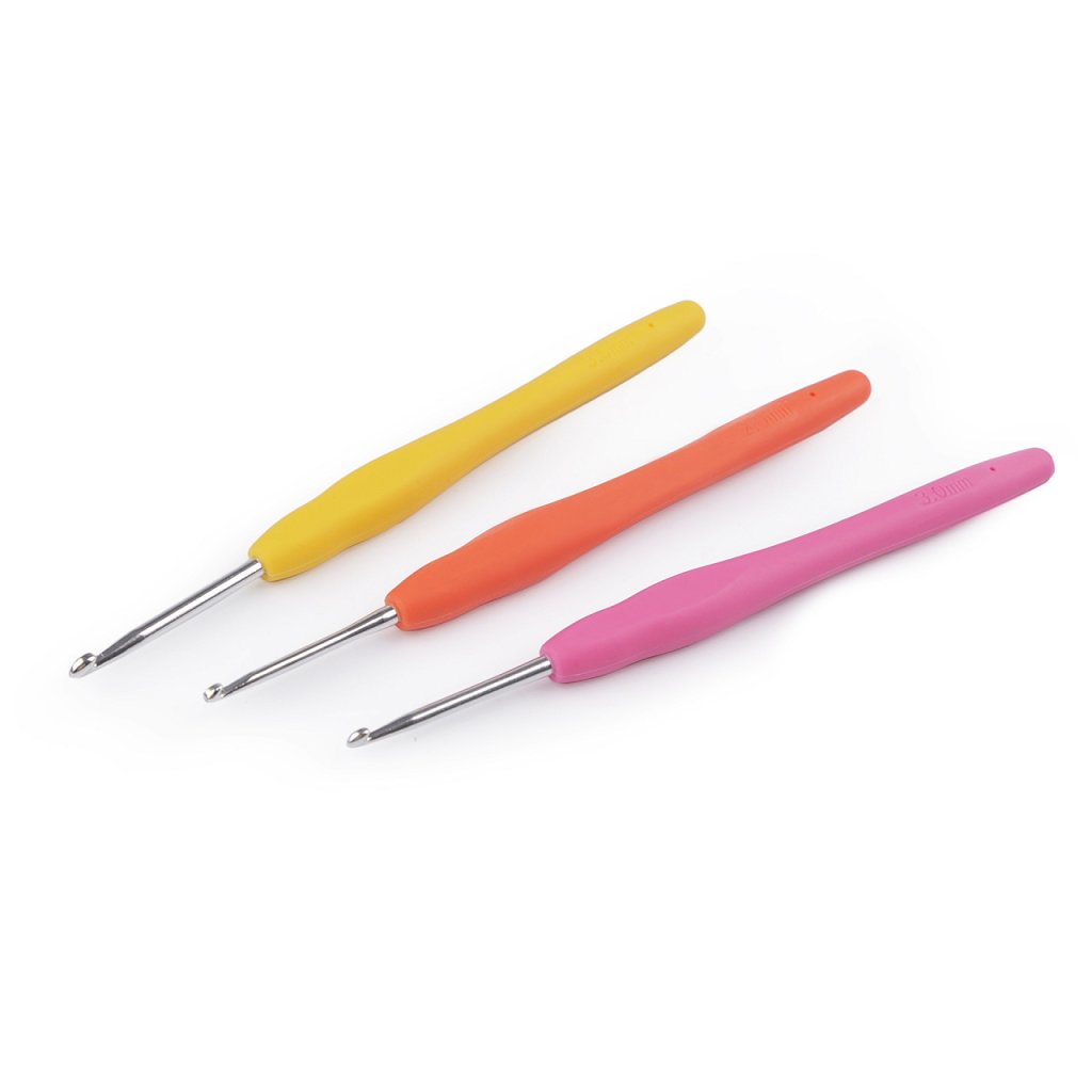 Dank des ergonomischen Silikongriffs liegt die Häkelnadel angenehm in der Hand. Die Größe der Haken wird durch die Zahlen bestimmt – der Haken mit der niedrigsten Nummer ist der schwächste, der Haken mit der höchsten Nummer dagegen der stärkste.