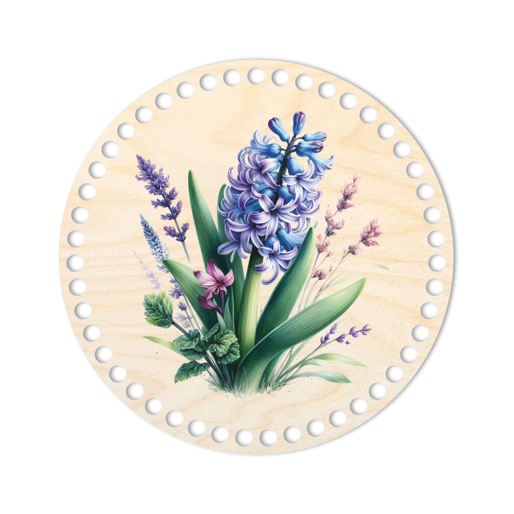 Dieser runde Holzboden aus Birken-Sperrholz mit Hyazinthenmotiv und einem Durchmesser von 20 cm ist nicht nur eine solide Basis für Häkelkörbe, sondern kann auch als stilvoller Holzdeckel verwendet werden.