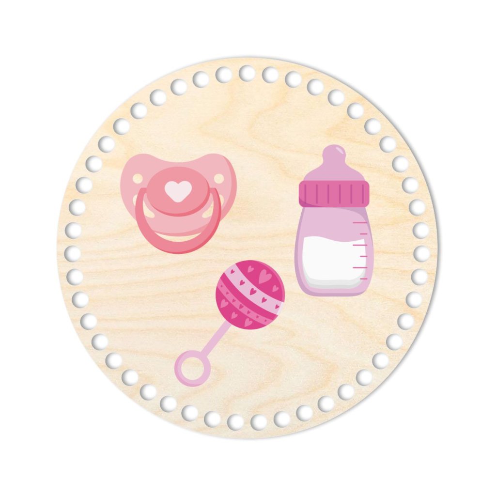 Dieser runde Holzboden aus Birken-Sperrholz mit Babygeschirr-Motiv und einem Durchmesser von 20 cm ist nicht nur eine solide Basis für Häkelkörbe, sondern kann auch als stilvoller Holzdeckel verwendet werden.