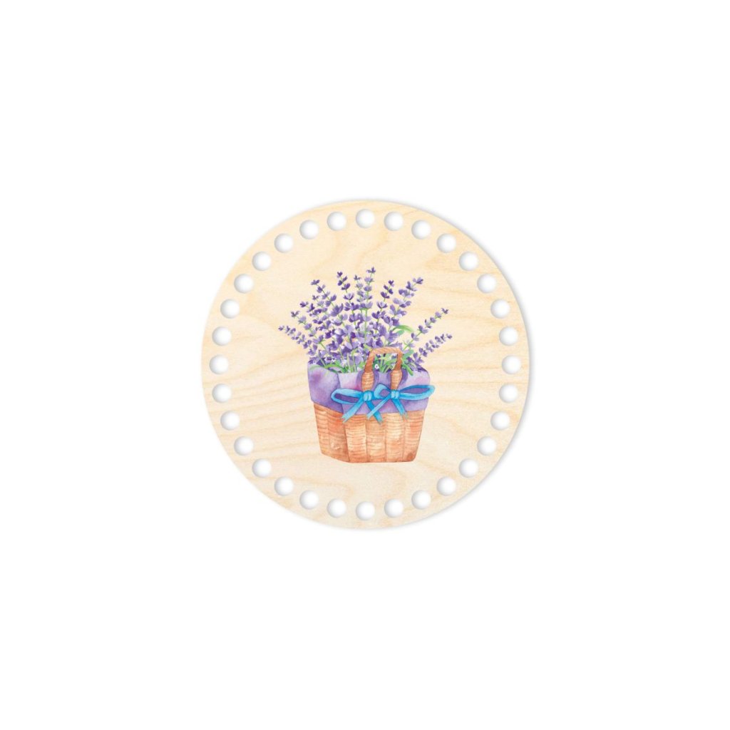 Holzdeckel mit Lavendelkorbmotiv für Häkelkörbe aus Spaghetti-Garn. Das Motiv ist mit einem UV-Drucker auf den Holzdeckel aus Birken-Sperrholz gedruckt.