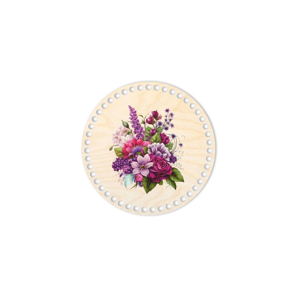 Holzdeckel mit dem Motiv "Lila Blumen" für Häkelkörbe aus Spaghetti-Garn. Das Motiv ist mit einem UV-Drucker auf einen Holzdeckel aus Birken-Sperrholz gedruckt.