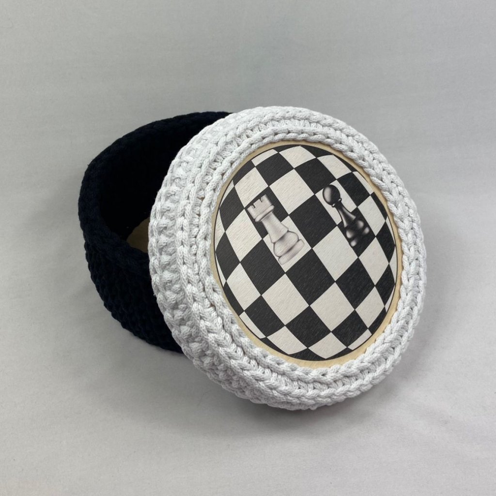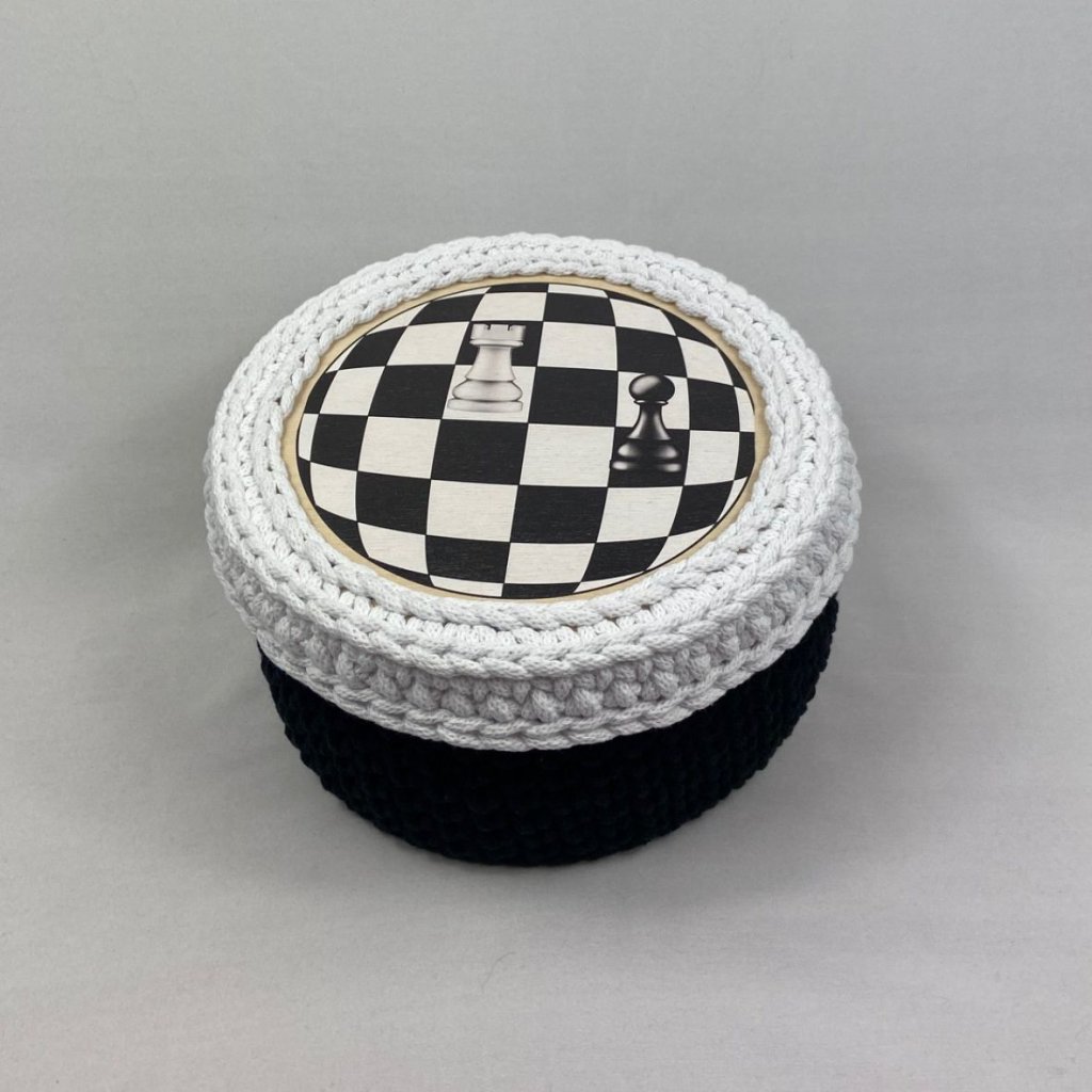 Holzdeckel für Häkelkörbe aus Spaghetti-Garn. Das Motiv wird mit einem UV-Drucker gedruckt.