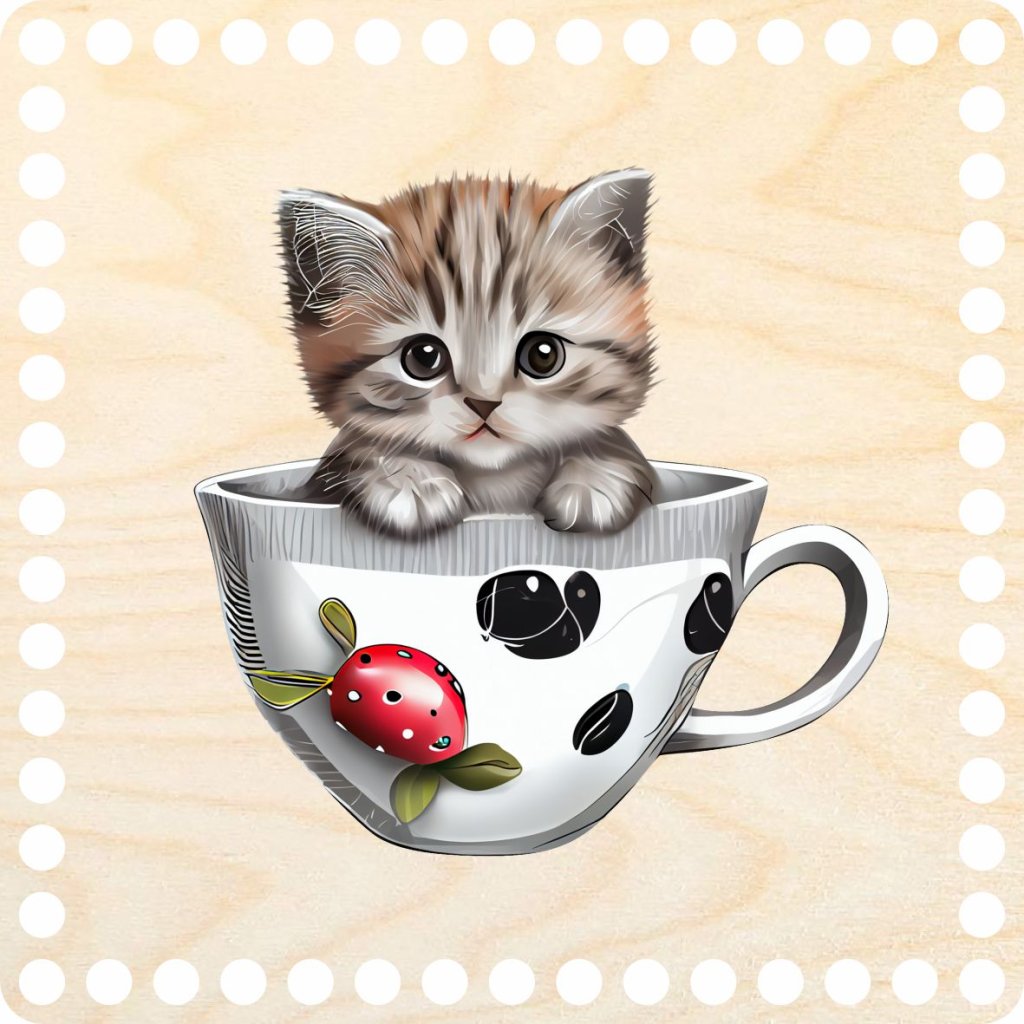 Holzboden/Deckel - quadratisch 20x20 cm, Katze im Becher