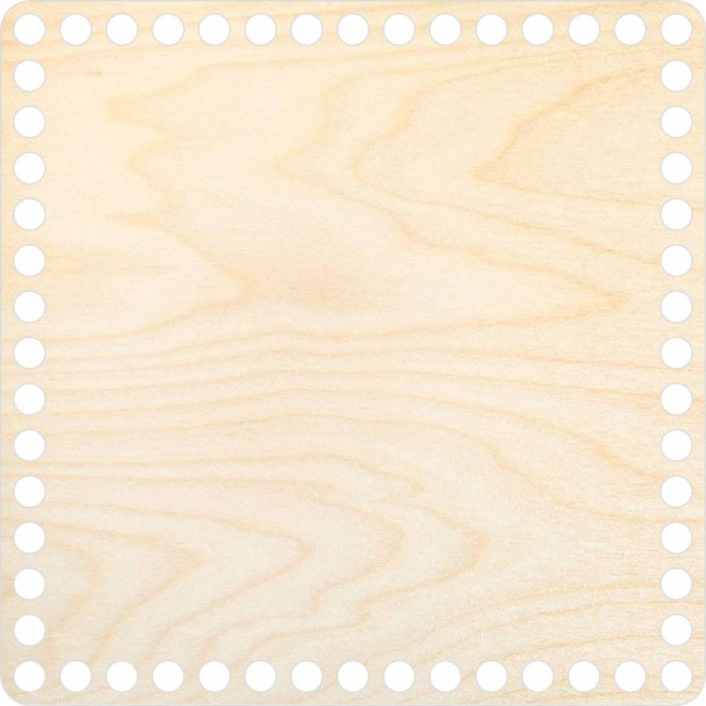 Quadratischer Holzboden (20 × 20 cm) aus 3 mm Birken-Sperrholz. Für Körbchen aus Textil- oder Kordelgarn geeignet; als Deko oder Aufbewahrung nutzbar.