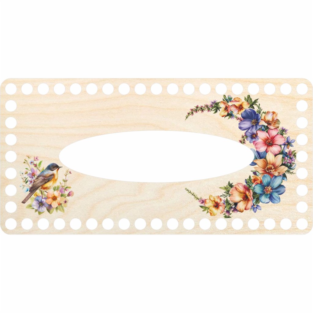 Der rechteckige Deckel mit einem farbigen Aufdruck eines Vogels und von Blumen ist aus hochwertigem Birkensperrholz mit einer Stärke von 3 mm gefertigt. Er bildet einen perfekten und eleganten oberen Teil für Ihre gehäkelte Taschentuchhülle.