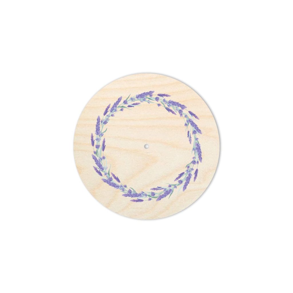 Holzdeckel mit dem Motiv "Lavendelkreis" für Häkelkörbe aus Spaghetti-Garnen. Das Motiv wird mit einem UV-Drucker auf einen Holzdeckel aus Birken-Sperrholz gedruckt.
