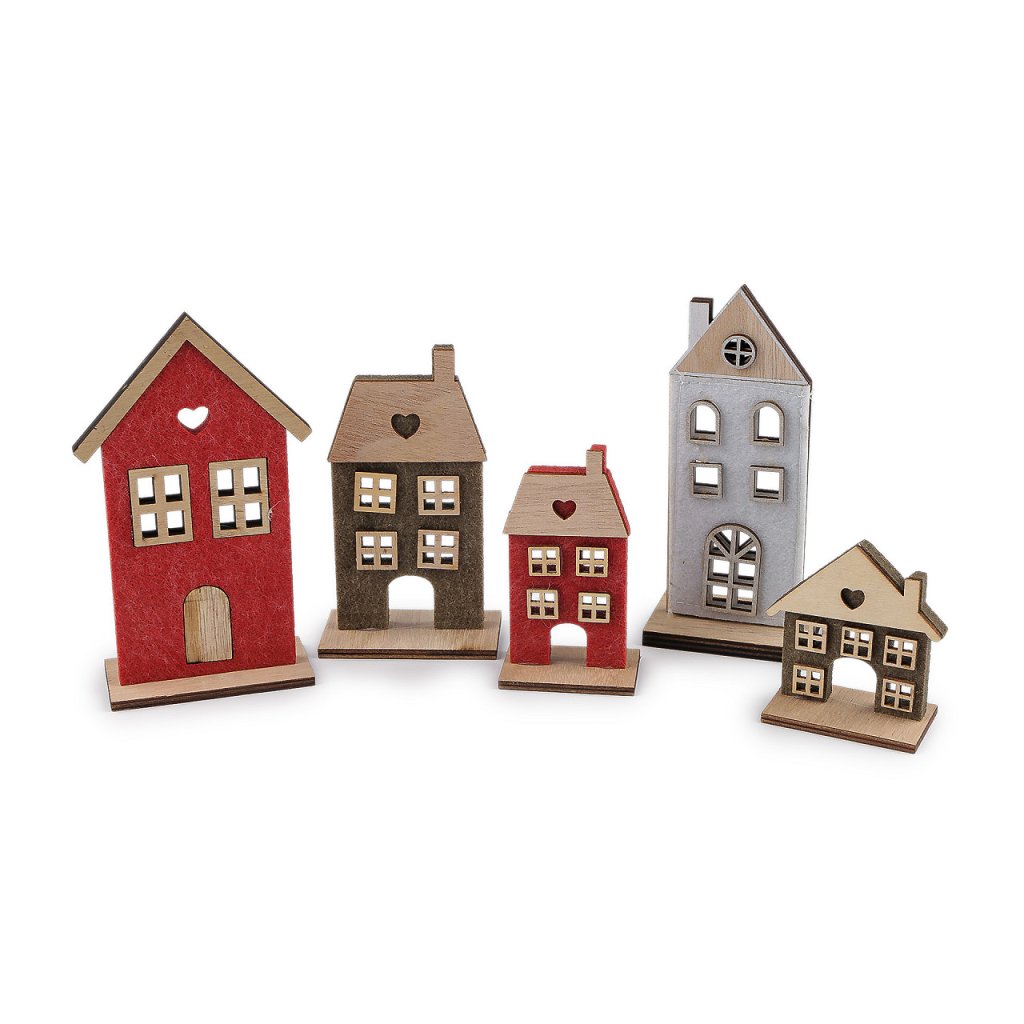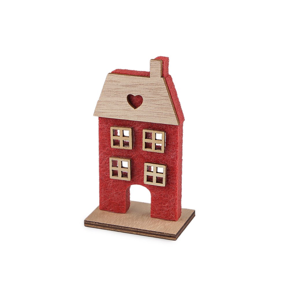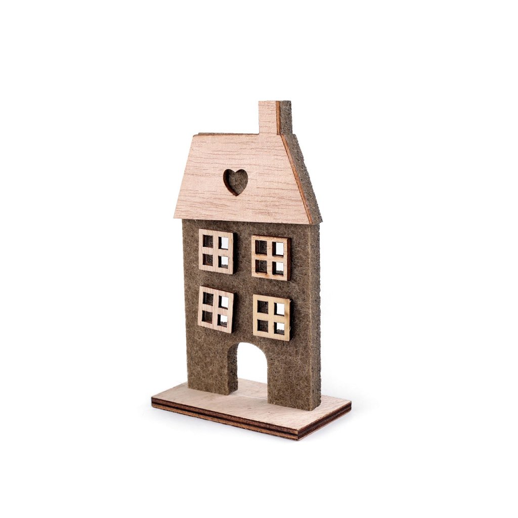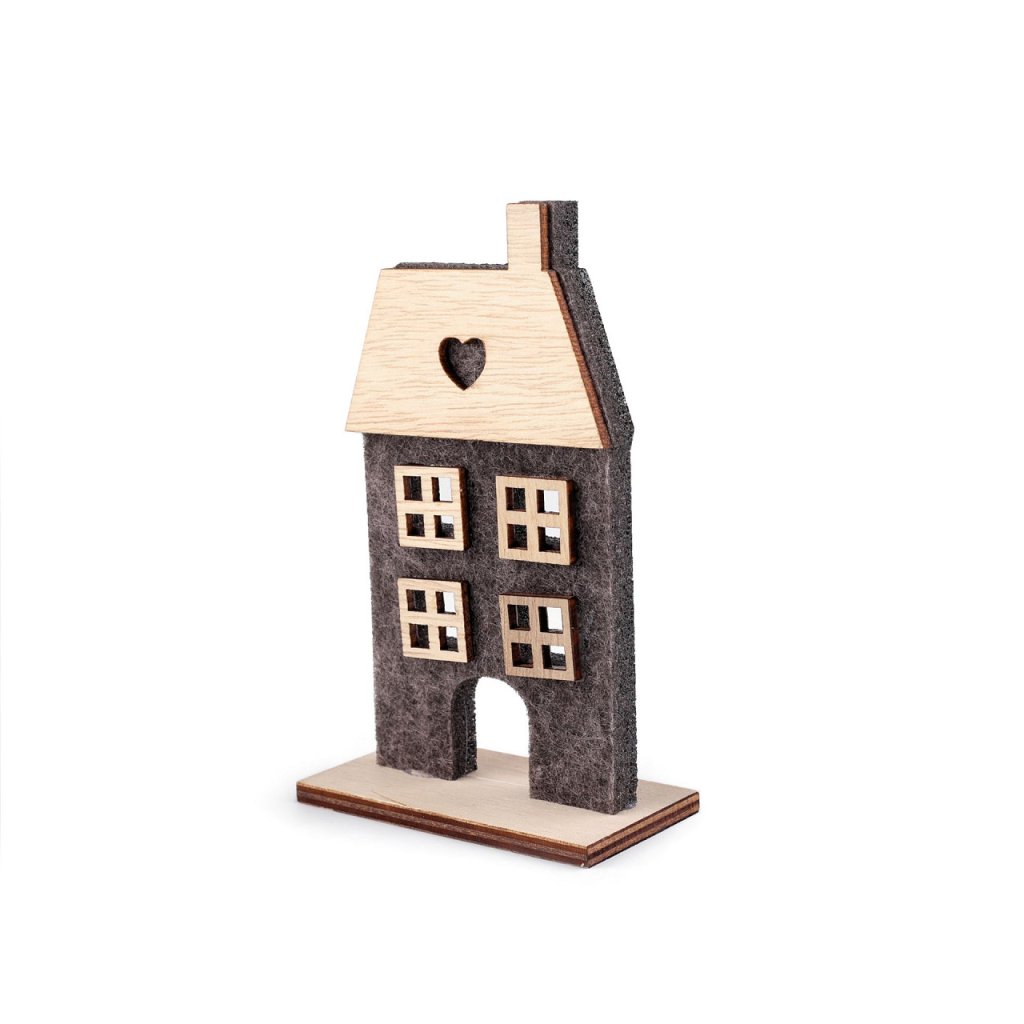 Sie können das Deko-Haus auf ein Fensterbrett, ein Regal oder sogar einen Kaminsims stellen. Es wird verschiedene Arrangements stilvoll ergänzen. Das Material ist eine Kombination aus Holz und Filz. Die Häuser sind einseitig, nur Variante Nr. 2 ist doppelseitig. Maße Nr. 1: 7 x 15,5 x 4,5 cm. Maße Nr. 2: 8 x 15 x 4 cm. Maße Nr. 3: 7,5 x 12,5 x 4 cm. Maße Nr. 4: 7,5 x 12,5 x 4 cm. Maße Nr. 5: 6 x 7,5 x 3,5 cm. Maße Nr. 6: 5,5 x 10 x 3,5 cm.
