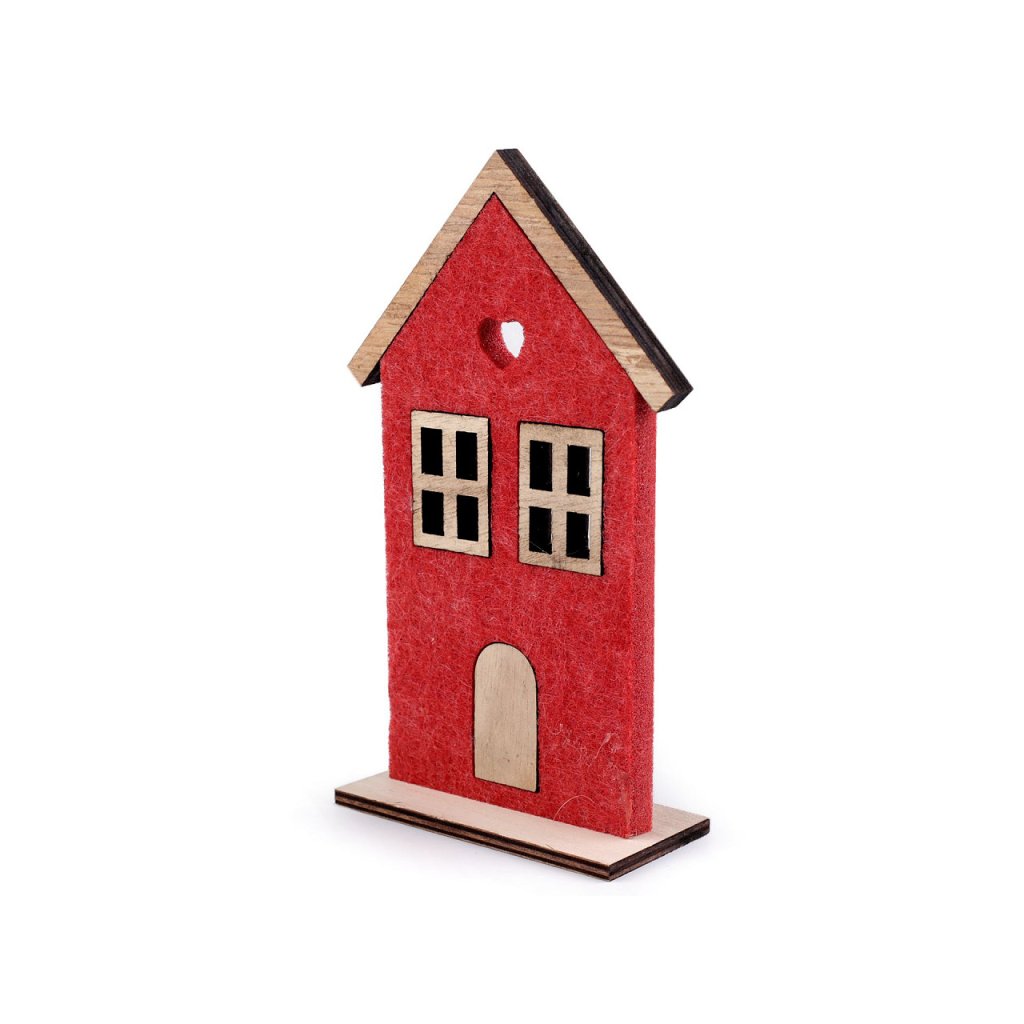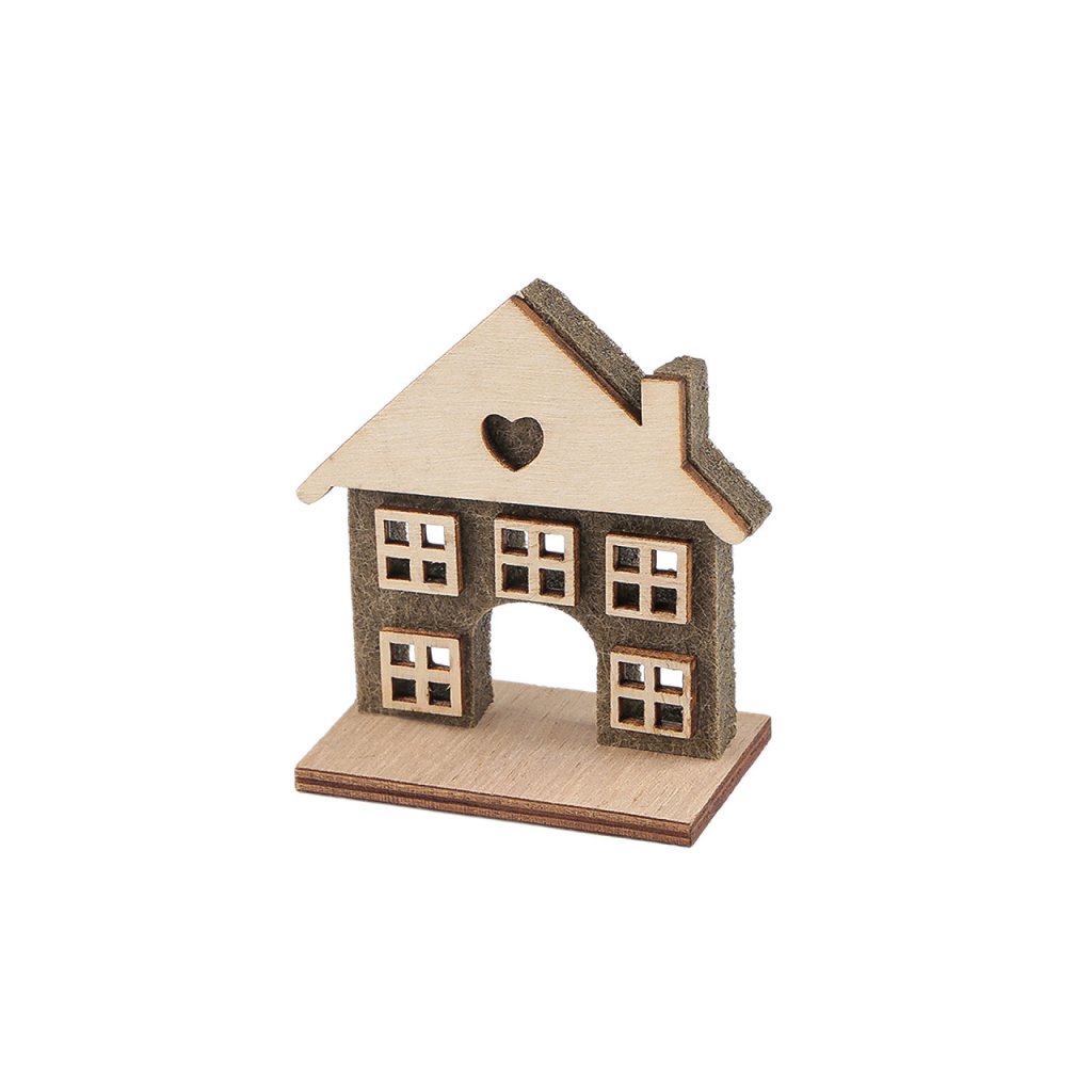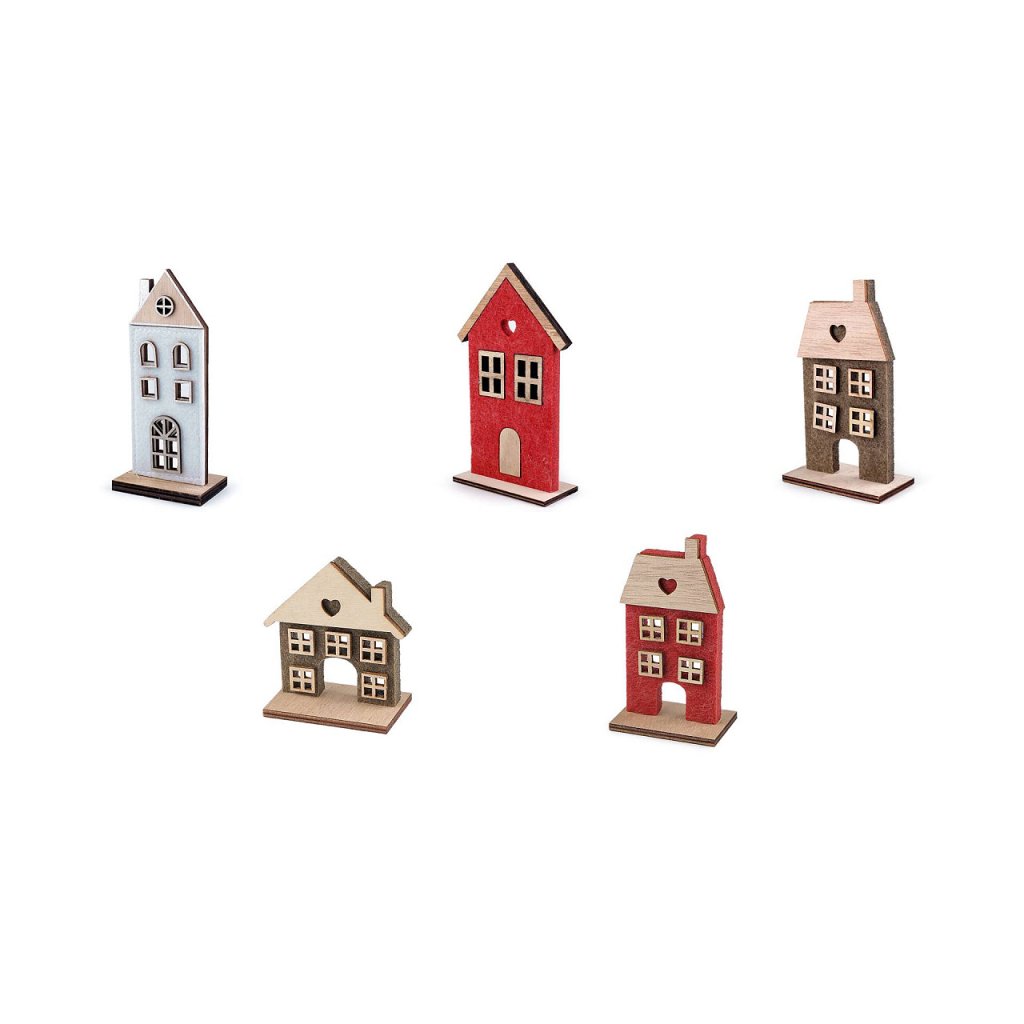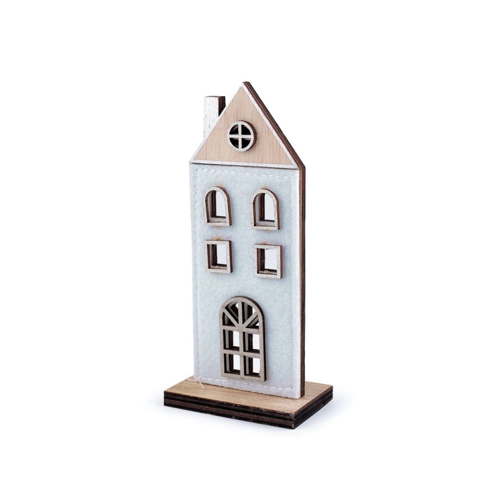 Sie können das Deko-Haus auf ein Fensterbrett, ein Regal oder sogar einen Kaminsims stellen. Es wird verschiedene Arrangements stilvoll ergänzen. Das Material ist eine Kombination aus Holz und Filz. Die Häuser sind einseitig, nur Variante Nr. 2 ist doppelseitig. Maße Nr. 1: 7 x 15,5 x 4,5 cm. Maße Nr. 2: 8 x 15 x 4 cm. Maße Nr. 3: 7,5 x 12,5 x 4 cm. Maße Nr. 4: 7,5 x 12,5 x 4 cm. Maße Nr. 5: 6 x 7,5 x 3,5 cm. Maße Nr. 6: 5,5 x 10 x 3,5 cm.
