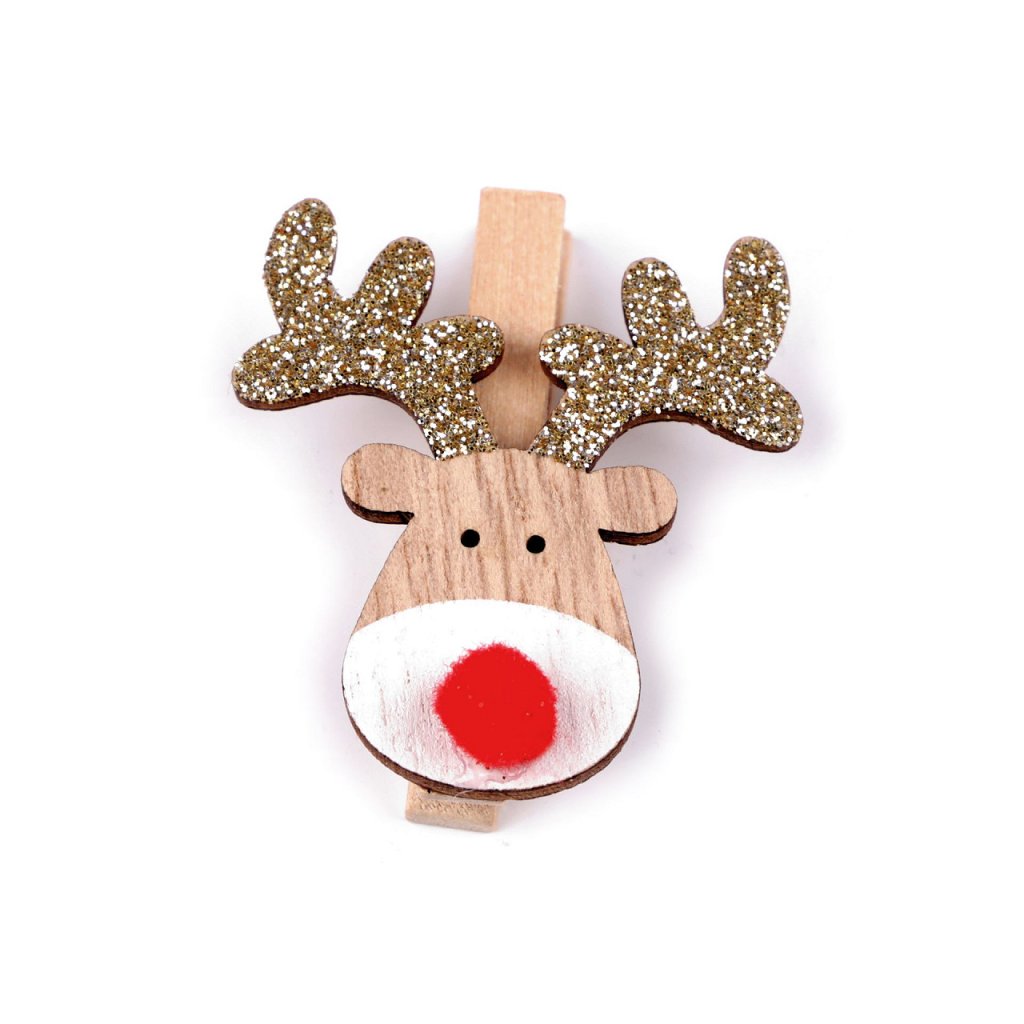 Holzklammern sind mit einem niedlichen Rentier verziert. Das Geweih ist mit funkelndem Glitzer hervorgehoben, die Schnauze besteht aus einem kleinen Bommel. Die Klammer dekoriert stilvoll Weihnachtsgeschenke, Tüten, Tüten oder Blumentöpfe und Gestecke.