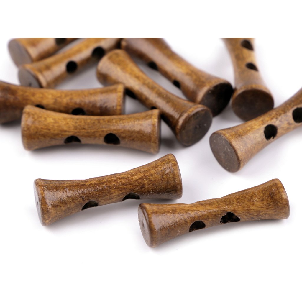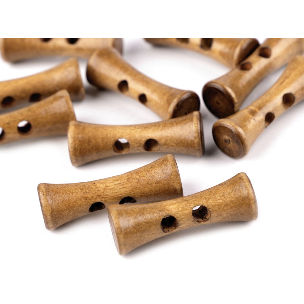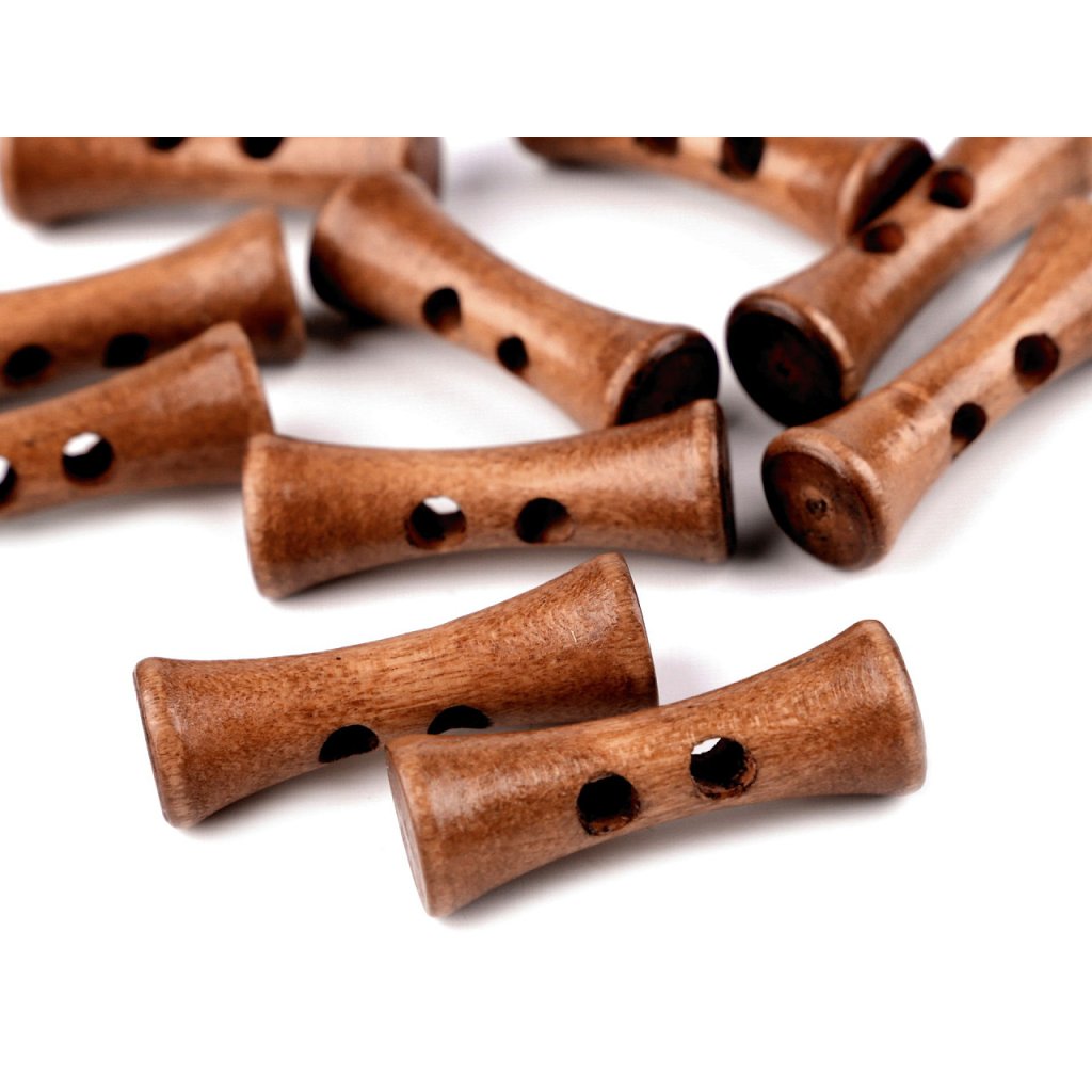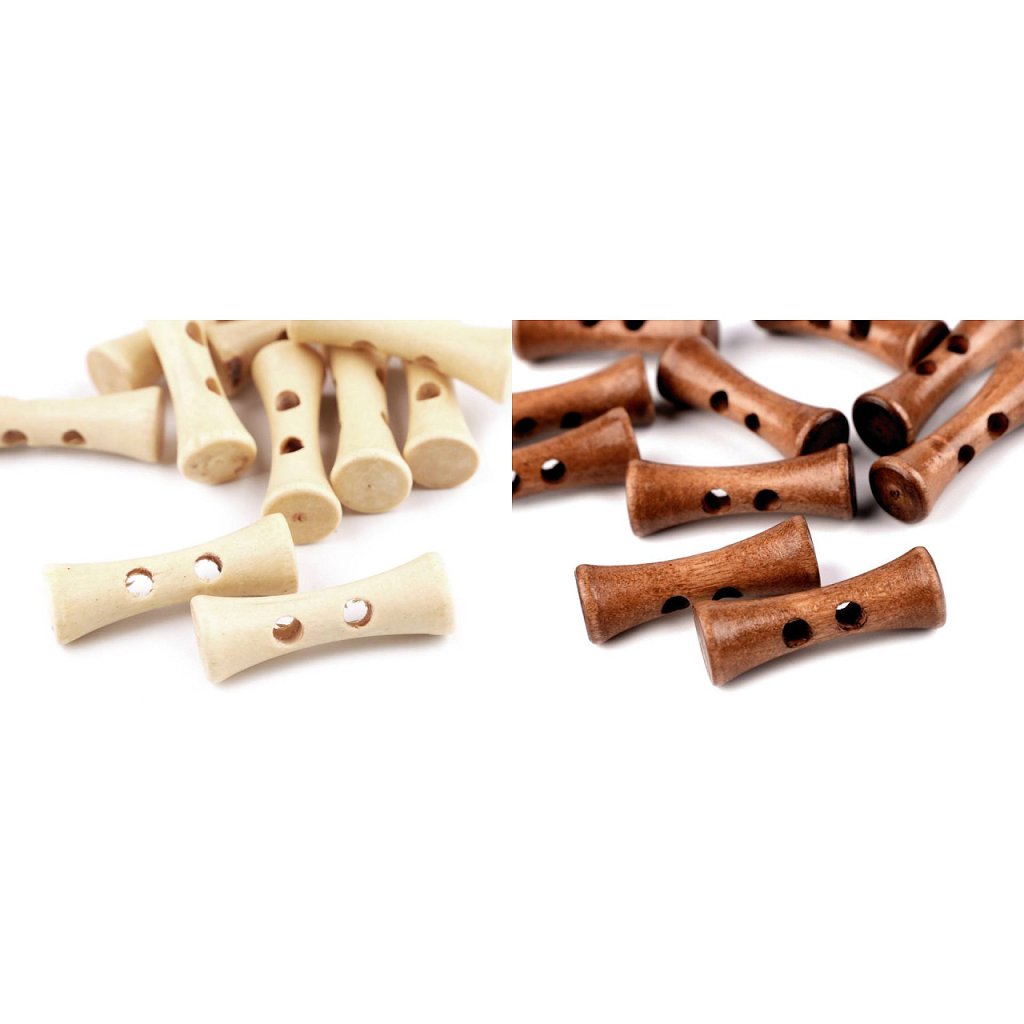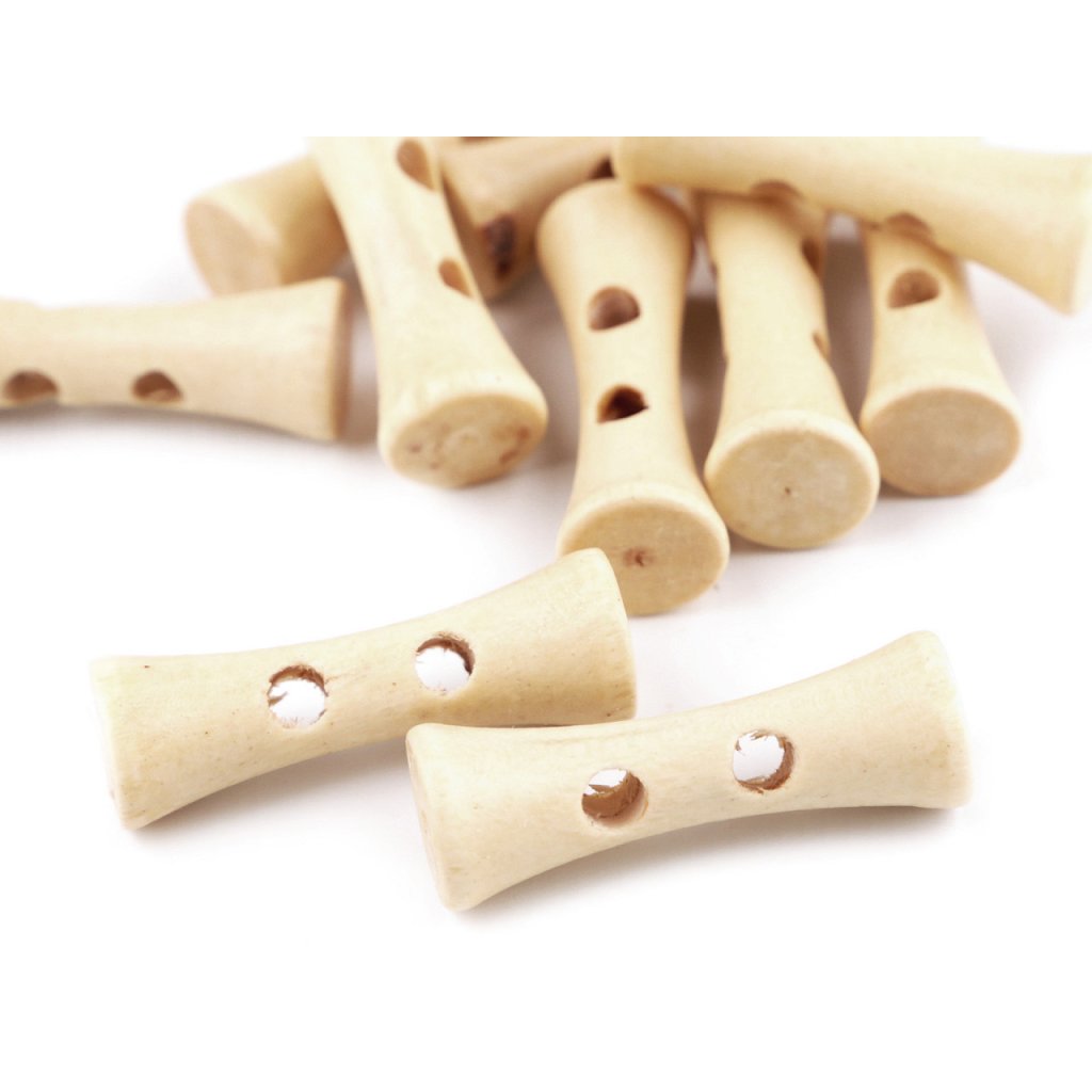 Originelle längliche Holzknöpfe sind für Pullis, Sweatshirts, Jacken oder Taschen bestimmt, sie eignen sich aber auch als Verzierung von Kissen oder Schals.