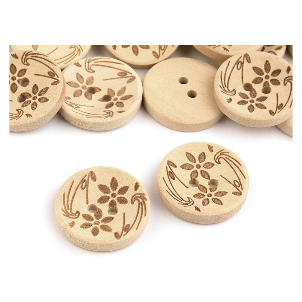 Die gewölbten Holzknöpfe sind einseitig mit einem lasergeschnittenen Blumenmotiv verziert. Sie eignen sich zu Dekorationszwecken und können auch auf Kleidung verwendet werden, sind jedoch nicht waschbar. Die Tastengrößen finden Sie in dieser Tabelle .