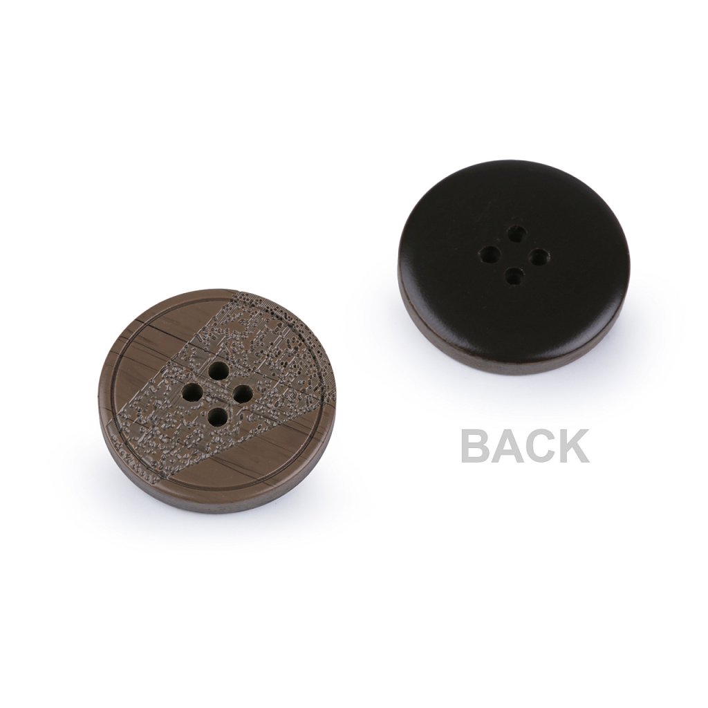 Die Vierlochknöpfe haben eine partiell lasergravierte Oberfläche. Sie fallen nicht nur auf Mänteln auf, sondern auch auf Pullovern, Westen usw. Die Größe der Buttons können Sie dieser Tabelle entnehmen .