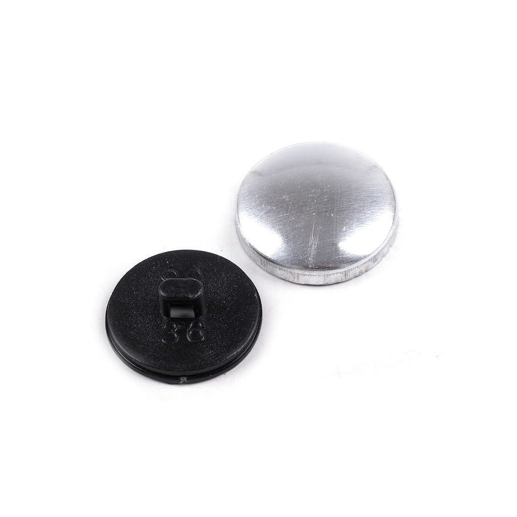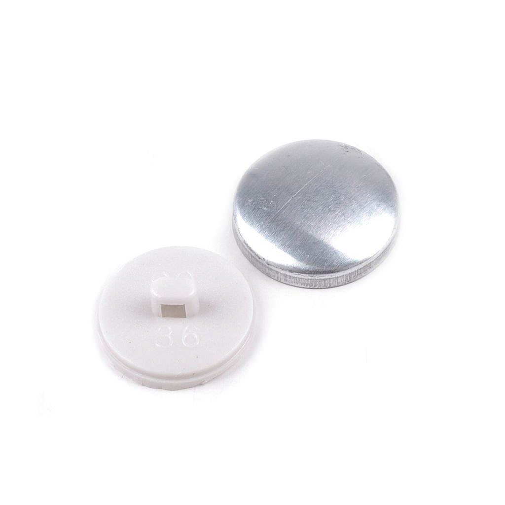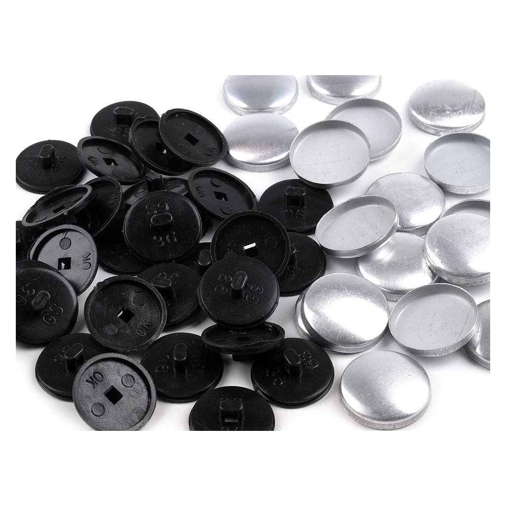 Knopf zum Beziehen besteht aus einem Metall- und Kunststoffteil. Zum Beziehen können verschiedene Materialien benutzt werden. Somit kann man effektvolle Verzierung von Bekleidung bilden.Zum Beziehen von Knöpfen braucht man eine Pressmaschine und einen Ausatz (Artikel-Nummer 090859). Tabelle für Knöpfengröße: