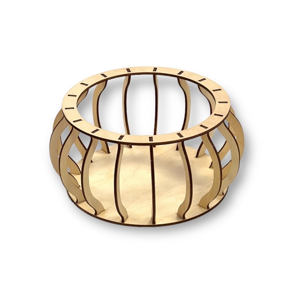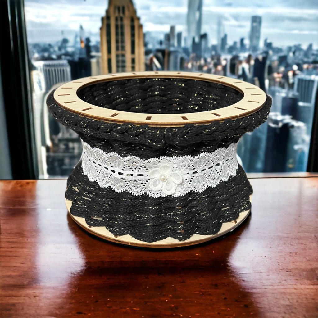 Wenn Sie die eingespannten Pfosten am oberen Ring nicht sehen möchten, können Sie einen 18 cm langen Makramee-Rahmen bestellen, den Sie auf den oberen Ring kleben. Alternativ können Sie auch einen Holzdeckel mit einem Durchmesser von 15 cm kaufen, der dann in Kombination mit dem Ring gut passt. Durch Drehen der Pfosten können Sie auch eine ungewöhnliche Häkelkörbe-Form kreieren, siehe letztes Foto.