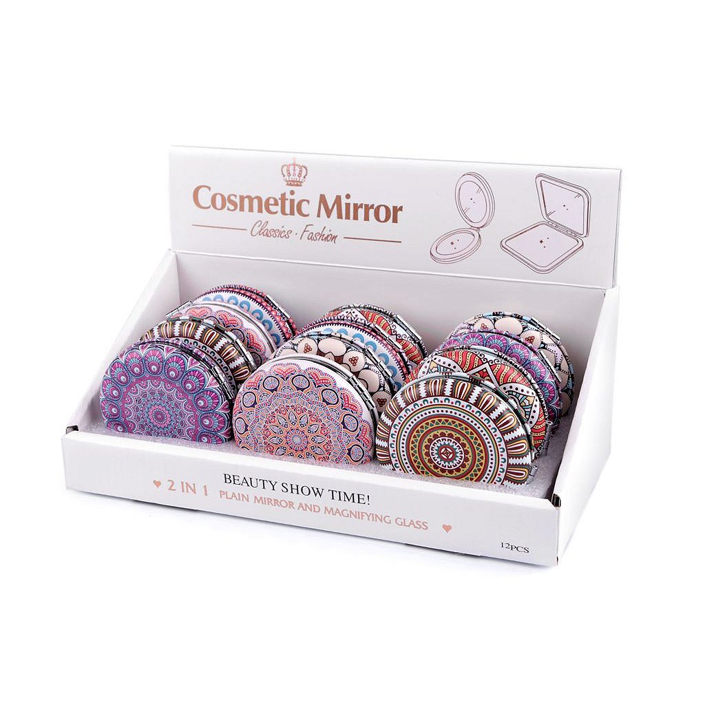 Der runde Spiegel ist eine große Hilfe, um Ihr Make-up tagsüber zu reparieren. Passt perfekt in jede Damenhandtasche. Hat hochwertige Öko-Leder-Verarbeitung mit kleinem Dekor . Im Inneren befinden sich 2 Spiegel, einer ist vergrößert. Unser Tipp: Der Spiegel ist ein schönes kleines Geschenk zum Valentinstag oder zu anderen Anlässen. Spiegel im Packungsmix von 12 Stück sind in einem Karton verpackt. Im Inneren befindet sich ein Ständer , der für die Ausstellung im Laden geeignet ist, siehe Foto. Die Box ist 12 x 24 x 9 cm groß.