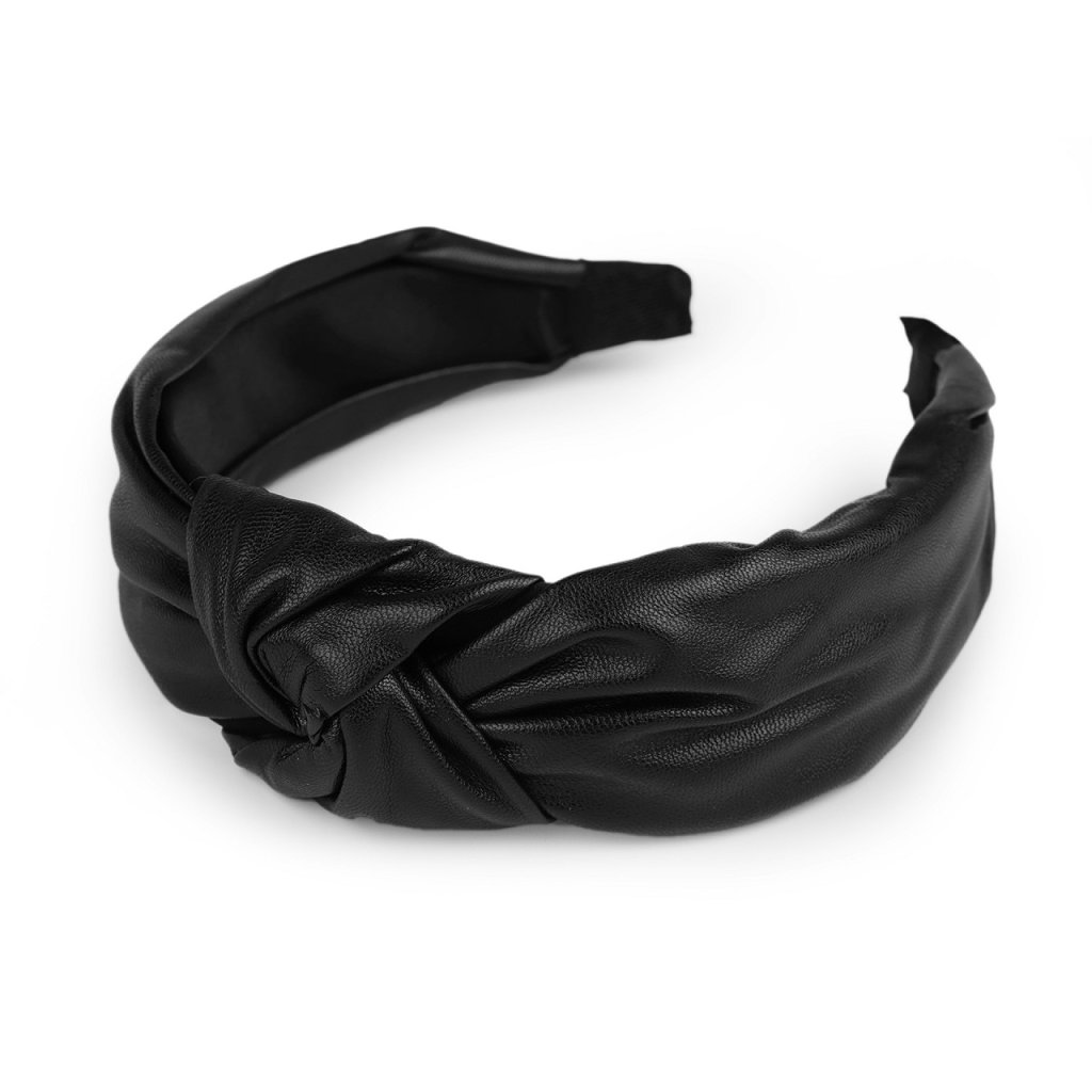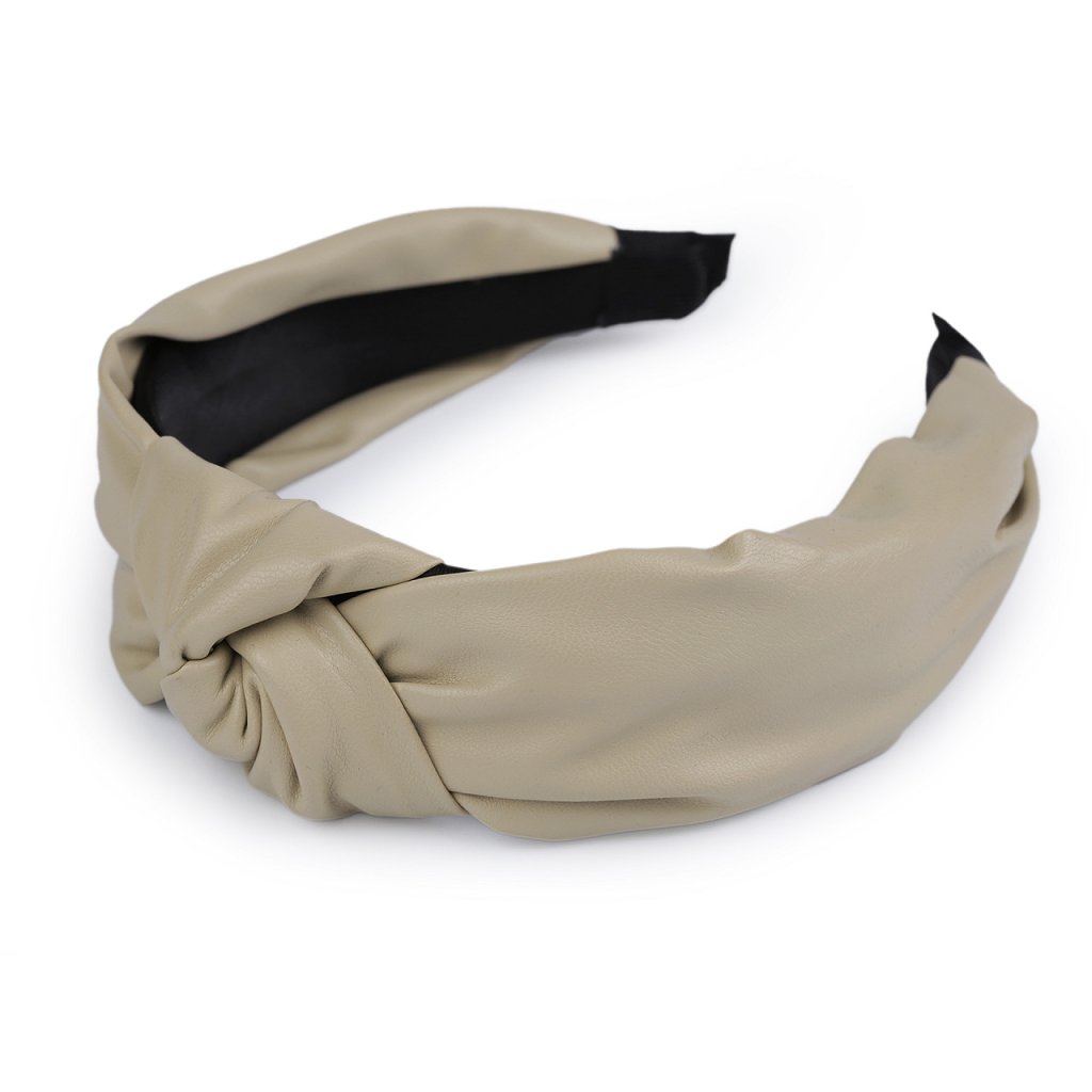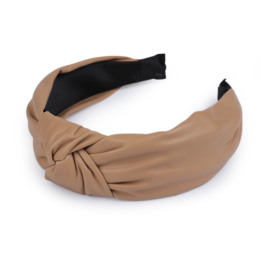 Das breite Lederstirnband ist in der Mitte mit einem Knoten verziert. Das Stirnband ist elegant und stilvoll, Sie können es sowohl im Alltag als auch auf Partys verwenden. Die Innenseite des Stirnbandes ist mit Satin überzogen, es ist angenehm zu tragen.