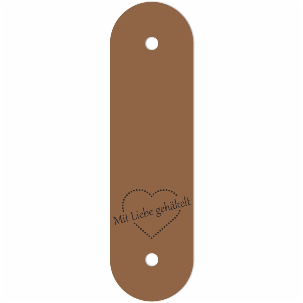 Kunstlederlabel – Mit Liebe gehäkelt (oberer Rand), Cognac