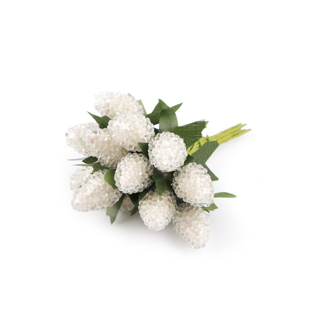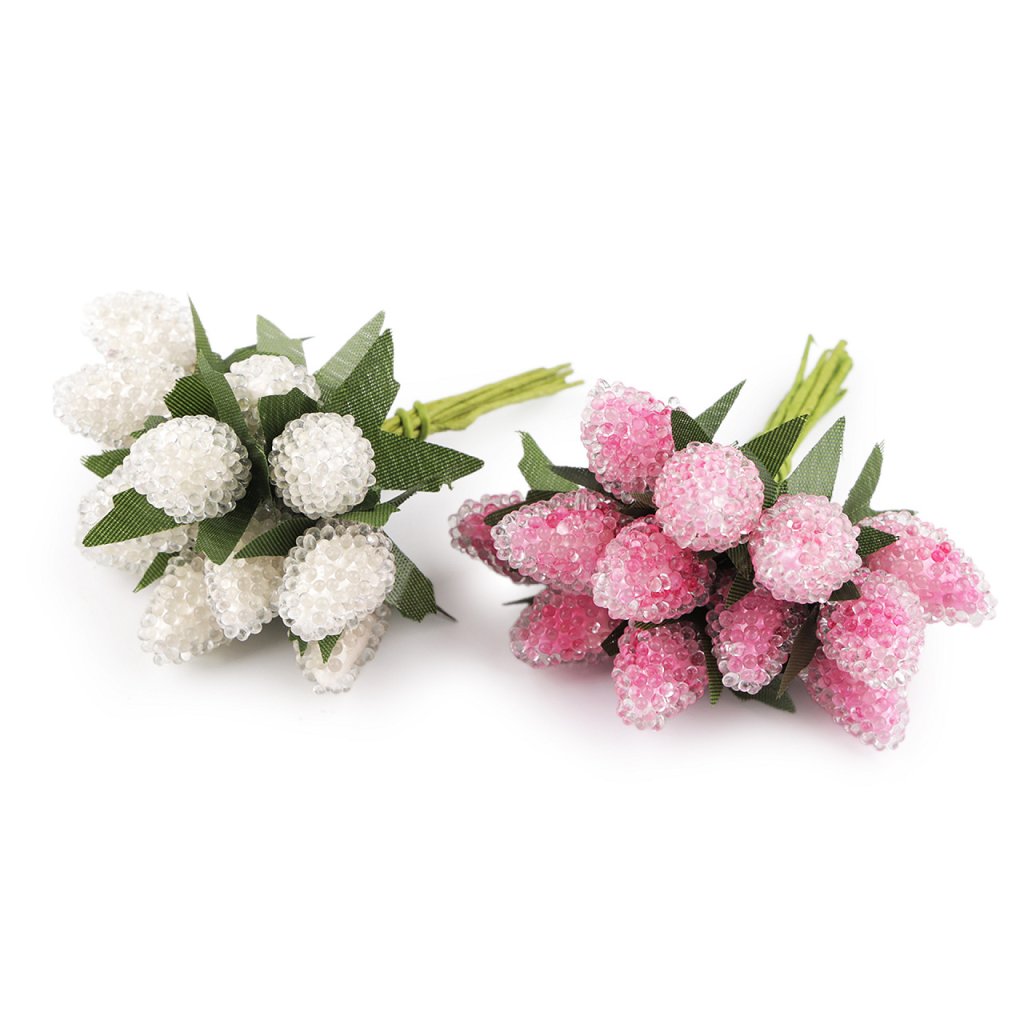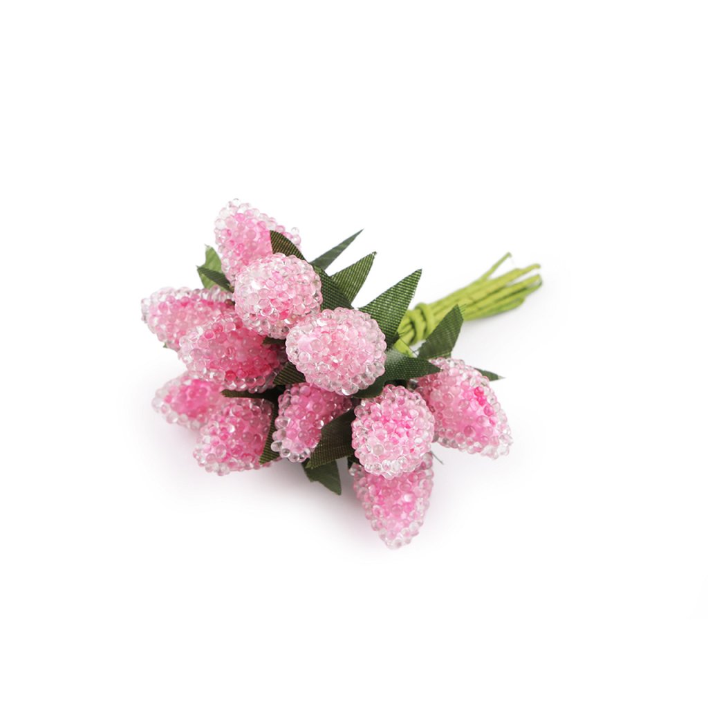 Deko-Erdbeeren sind mit kleinen transparenten Kugeln verziert, die den Eindruck von Eis erwecken. Dank des Drahtes lassen sie sich biegen. Sie können damit Kränze, kleinere Gestecke usw. dekorieren.