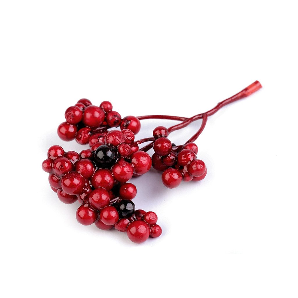 Diese Vogelbeerendekoration bilden kleine Kugeln aus Schaumgummi, bedeckt mit Farbe. Die einzelnen Bündel sind zu drei Stängeln aus Kunststoff befestigt, diese sind am Ende zusammenverbunden. In der Verbindung gibt es ein rundes Loch - mit der Stecknadel oder dem Nagel kann die Dekoration zur Unterlage befestigt werden.Bei einigen Beeren kann die Farbe leicht abgelöst sein.