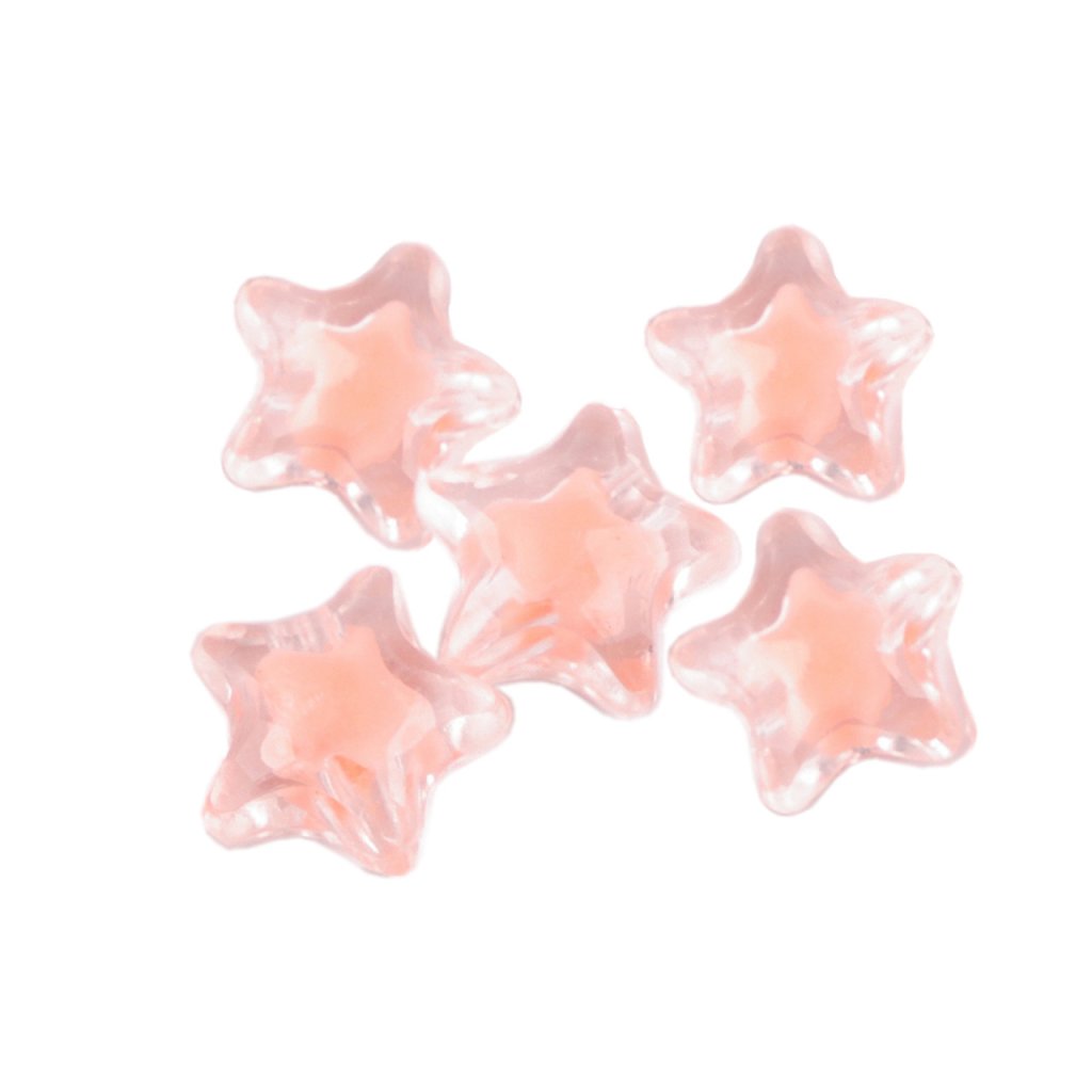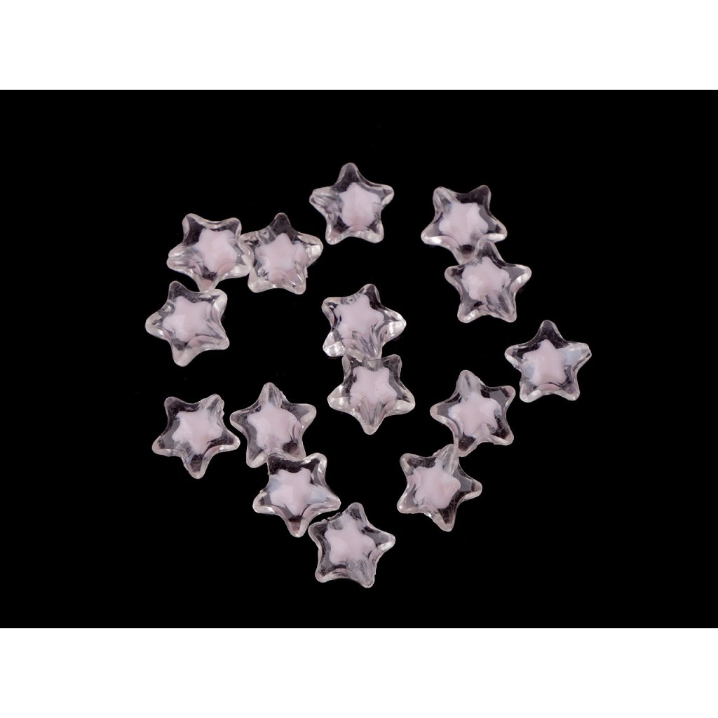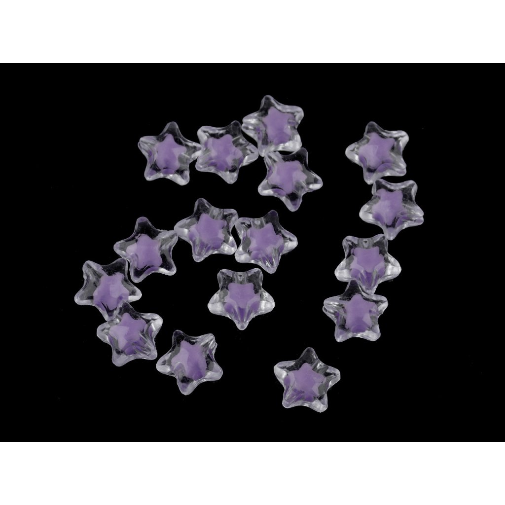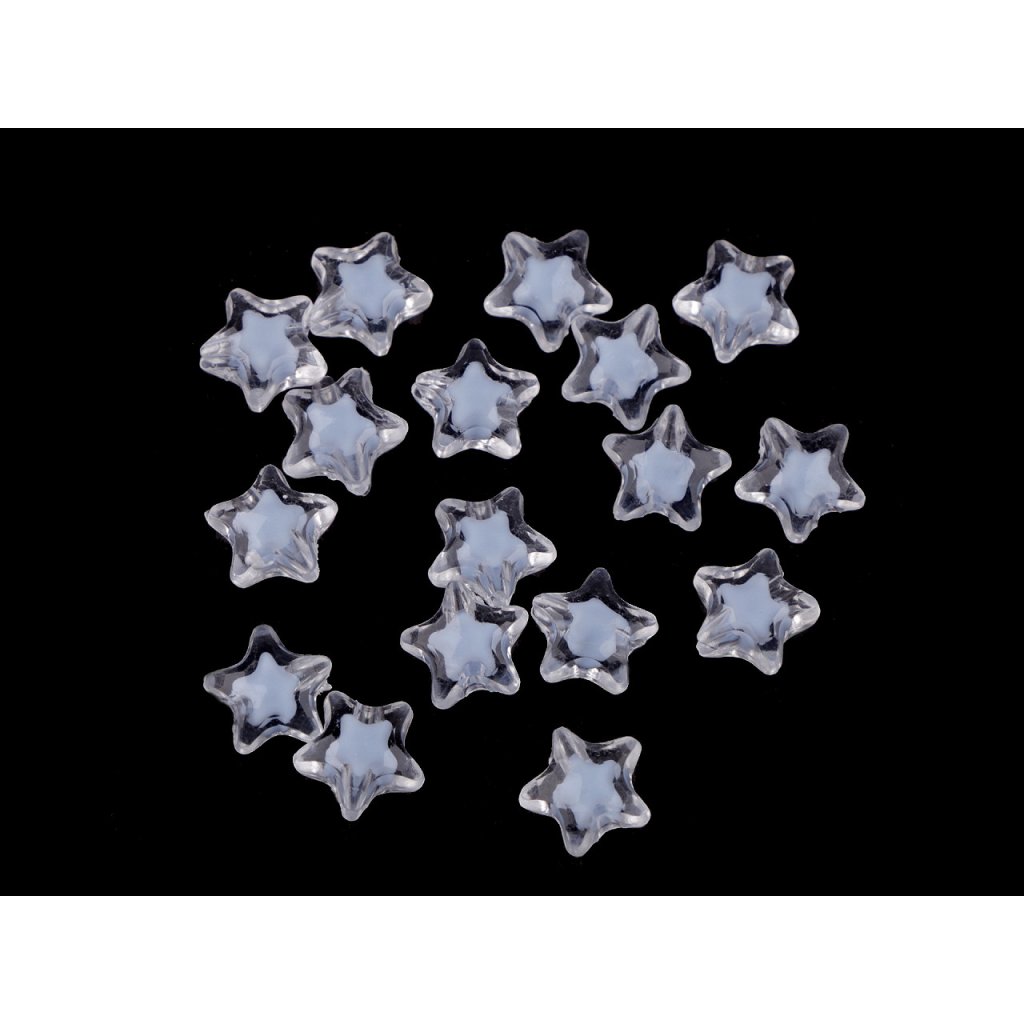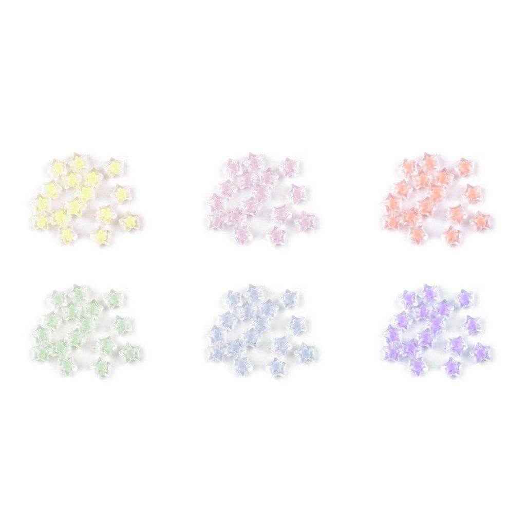 Kunststoffperlen in Form eines Sterns werden sowohl von Erwachsenen als auch von Kindern geliebt. Sie sind transparent, mit einem anderen farbigen Stern im Inneren. Sie können sie verwenden , um Schmuck , Schlüsselanhänger usw. herzustellen. Sie können sie zum Beispiel auf Gummiband oder Nylon auffädeln . Es gibt ca. 28 Perlen in einer 10-g-Packung.