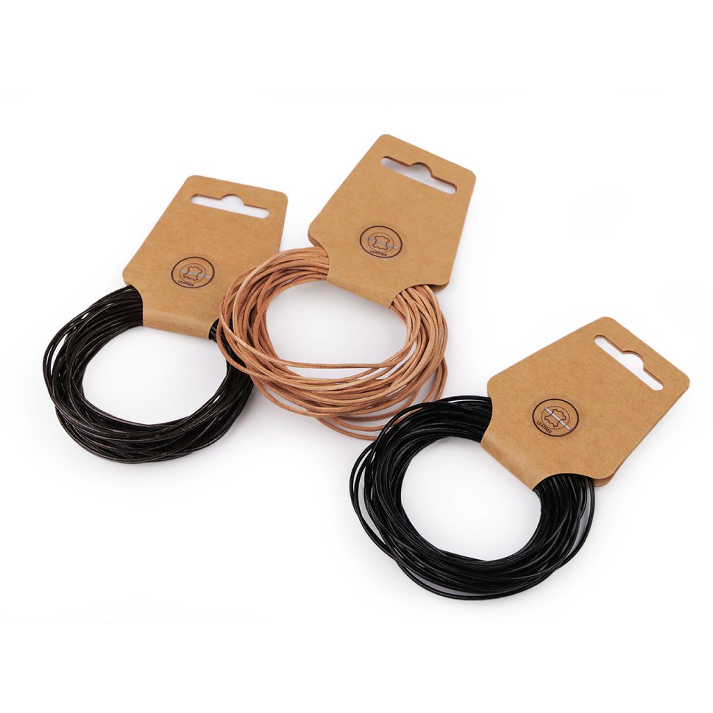 Die runde Lederschnur ist vielfältig einsetzbar. Es eignet sich zum dekorativen Schnüren von Kleidung und Handtaschen und ist neben Wachskordeln das am häufigsten verwendete Einfädelmaterial für Modeschmuck. Juweliere hängen Anhänger daran oder weben es auf verschiedene Weise zu Halsketten und Armbändern. Kordel Nr. 1 ist naturbelassen, nicht ganz rund, es ist flach, auf einer Seite glatt, auf der anderen geschliffen. Kabel-Nr. 2 und 3 sind rund, lackiert und haben eine glänzende Oberfläche.