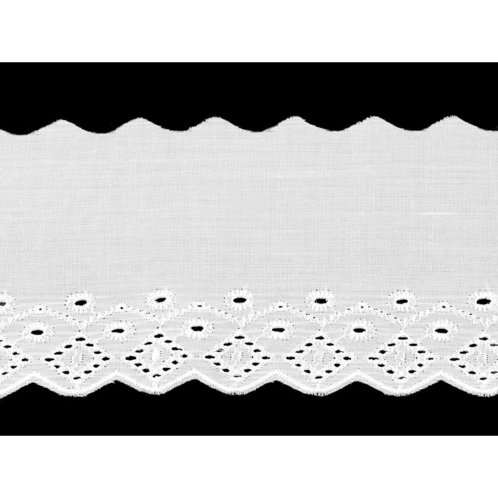 Madeira-Stoff mit Lochstickerei eignet sich hervorragend zum Verzieren von Tischdecken, Vorhängen oder Bettwäsche. Auch Kleidung lässt sich damit verzieren, indem man originelle und attraktive Details wie Ärmelsäume, Röcke oder Ausschnitte gestaltet. Die Breite des unvernähten Teils kann geringfügig variieren (±10%).