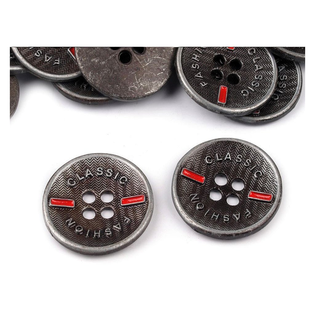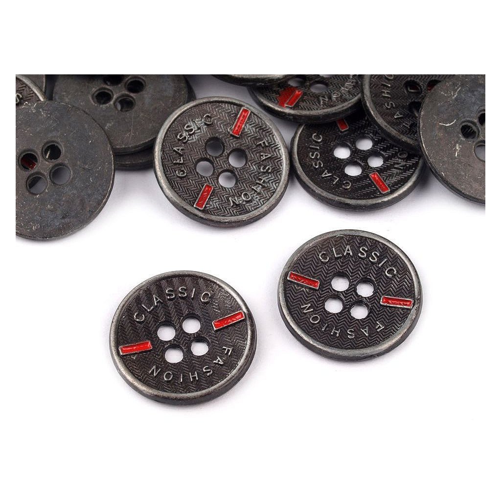 Die Knöpfe sind aus nicht magnetisierendem Metall hegestellt. Sie sind mit Aufschriften "classic" und "fashion" verziert. Mit vier Löchern. Bestimmt für Hemden, Jacken, Sweatjacken usw.