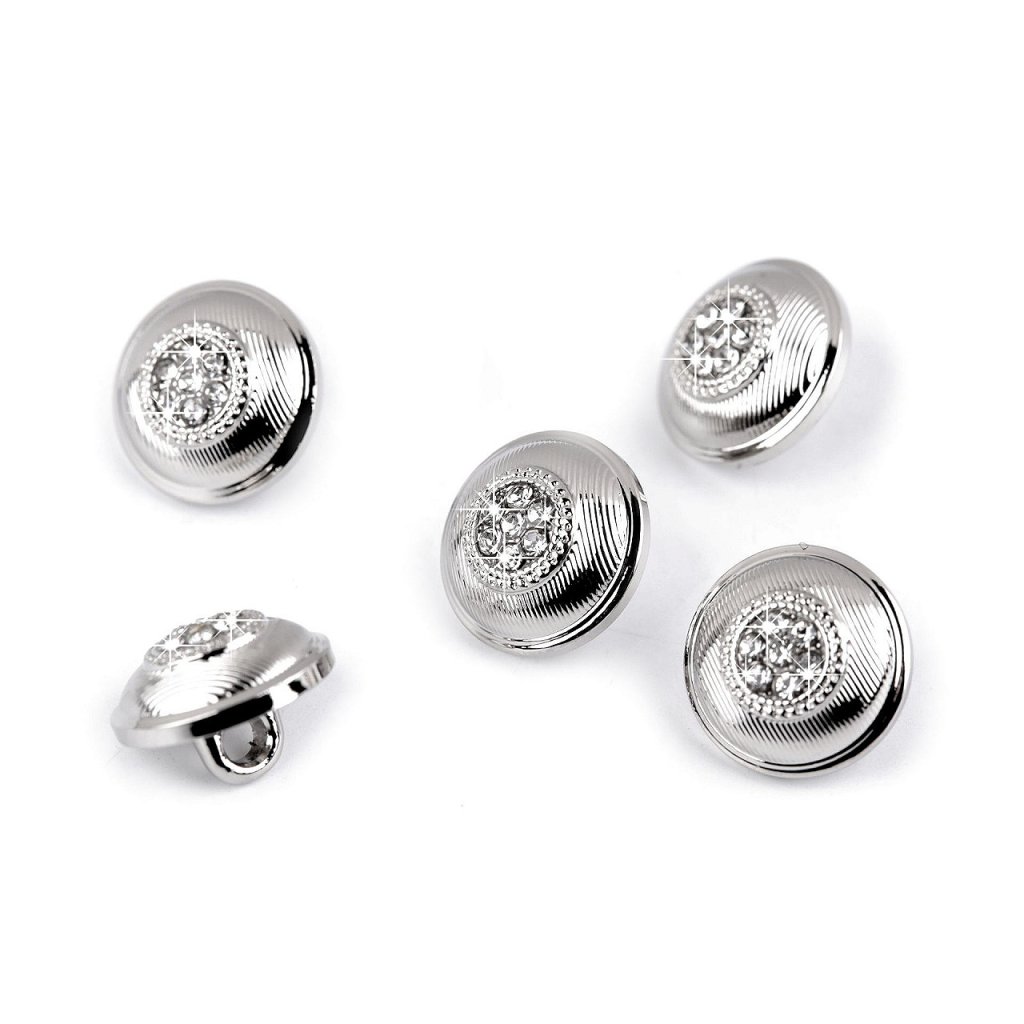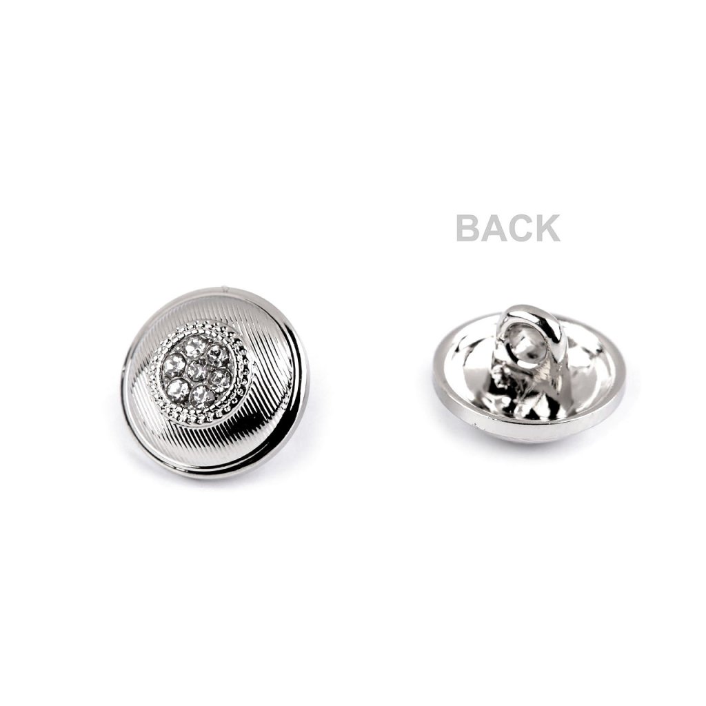 An Jacken, Hemden, Kleidern usw. stechen Metallknöpfe hervor. Sie verfügen über eine blütenförmige Mitte aus geschliffenen Steinen . Sie haben eine Naht unten. Die Größe der Schaltflächen finden Sie in dieser Tabelle .